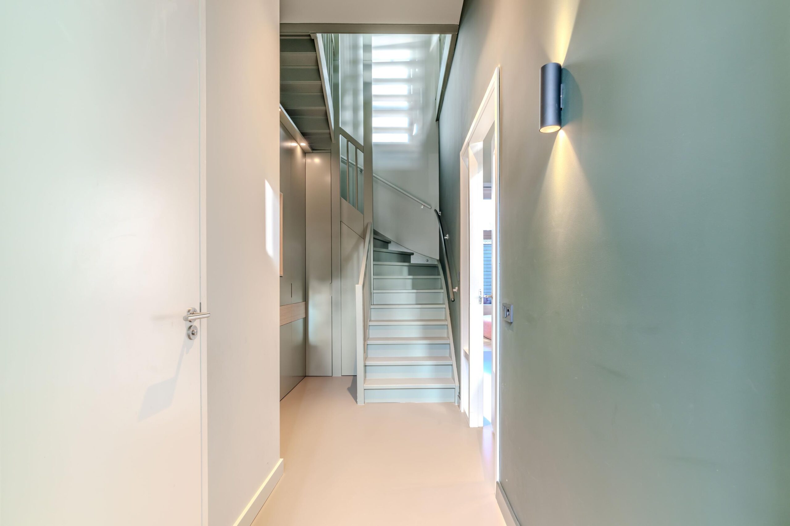 Upon entering, you’re immediately welcomed by the spacious open kitchen at the front of the house. It’s equipped with all modern appliances and, together with the cozy dining area and bar, forms the true heart of the home. The open layout flows seamlessly into the living room at the rear, stylishly separated from the kitchen by a modern open fireplace. The living room exudes calm and elegance thanks to the custom-built cabinetry, high ceilings, and large windows that flood the space with natural light. The herringbone floor in the living area and the poured concrete floor in the kitchen give the entire space a luxurious and contemporary feel.