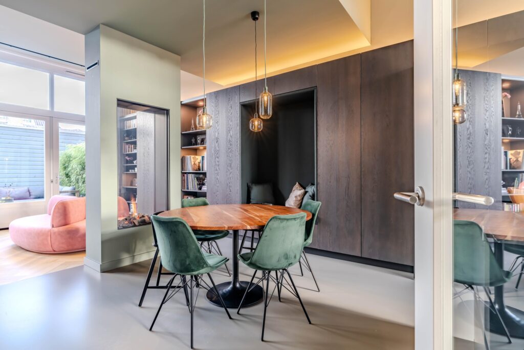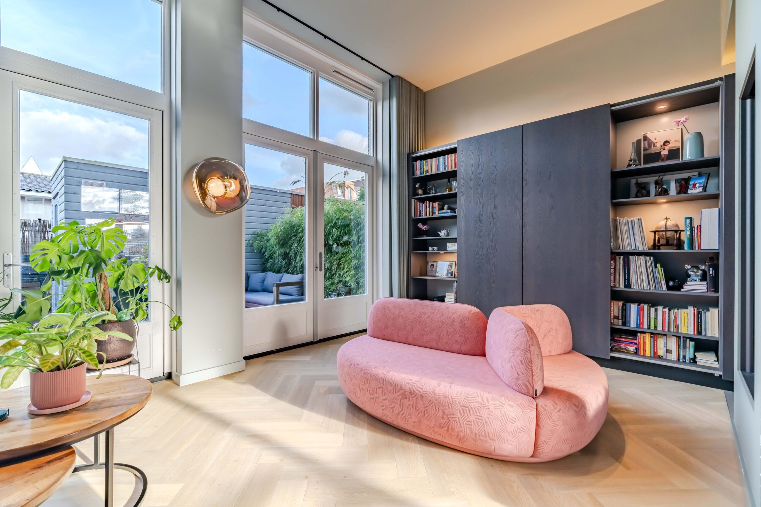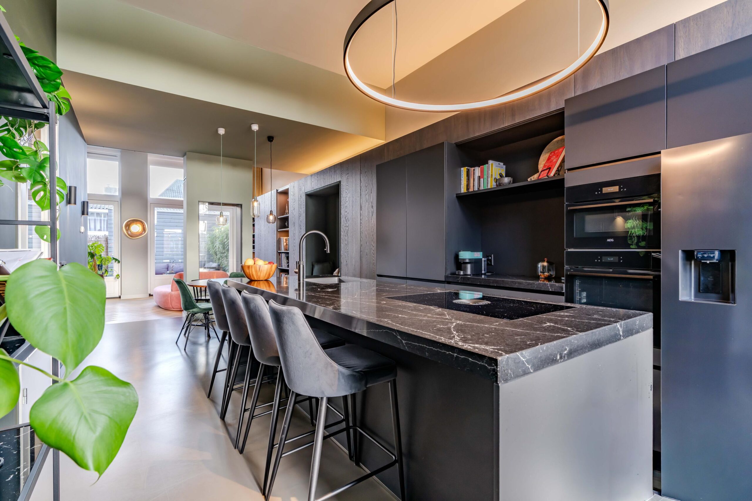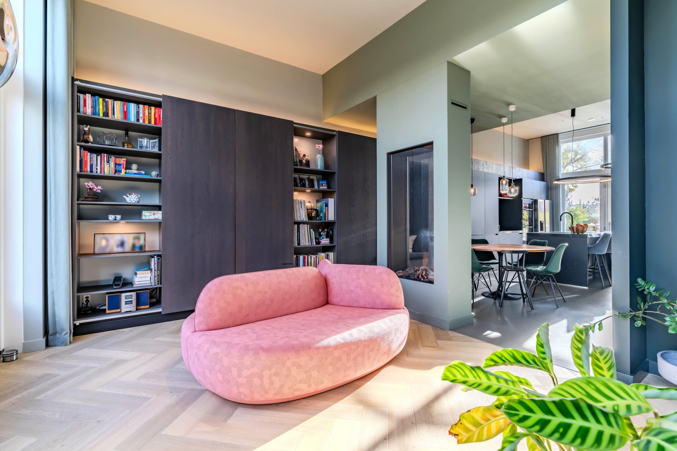 Bij binnenkomst valt direct de ruime woonkeuken op, aan de voorzijde van de woning. Deze is voorzien van alle hedendaagse moderne apparatuur en vormt met het gezellige eetgedeelte en de bar het hart van het huis. Via de open indeling loop je zo door naar de woonkamer aan de achterzijde, die door een stijlvolle open haard op natuurlijke wijze wordt gescheiden van de keuken. De woonkamer straalt rust en klasse uit dankzij de maatwerk inbouwkasten, het hoge plafond en de grote raampartijen die zorgen voor een prachtige lichtinval. De visgraatvloer in het woongedeelte en de gietvloer in de keuken geven het geheel een luxe en eigentijdse uitstraling.