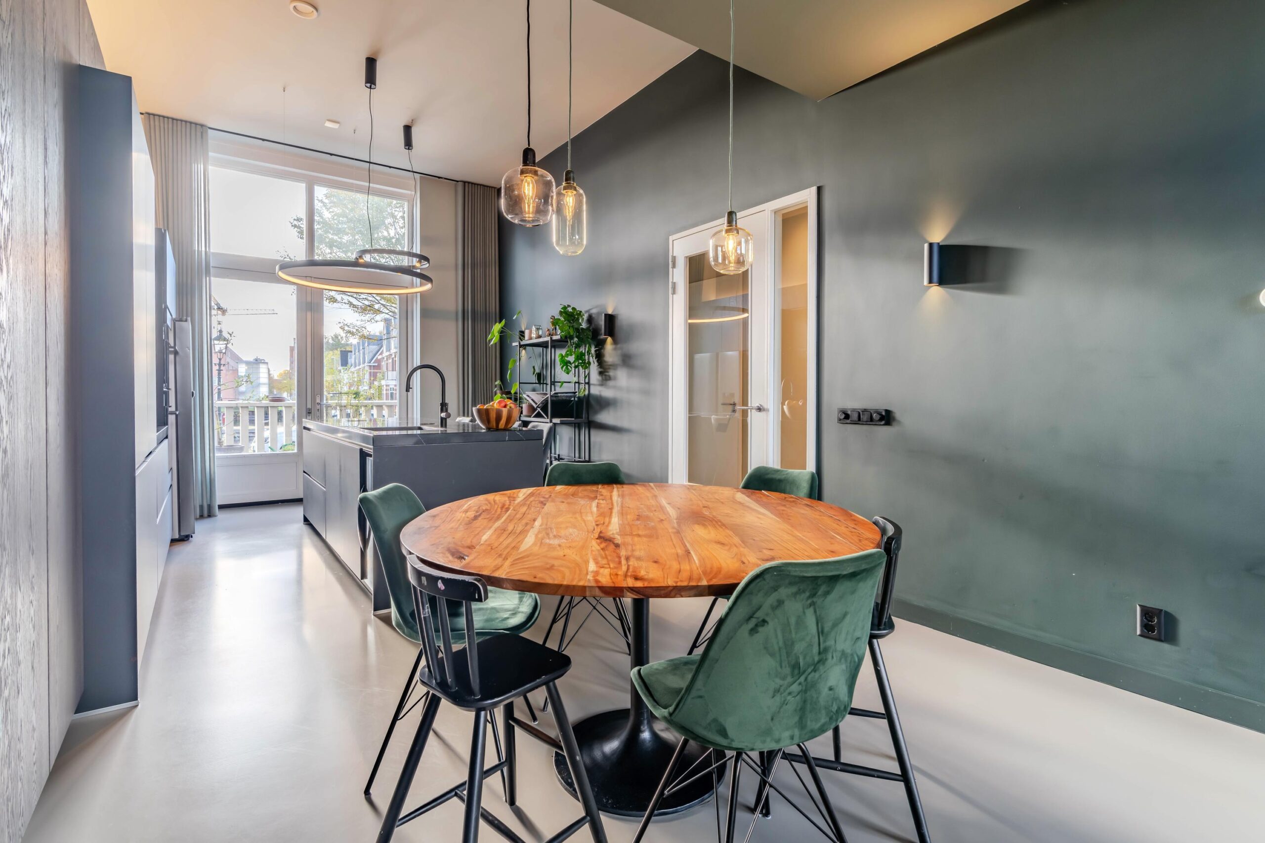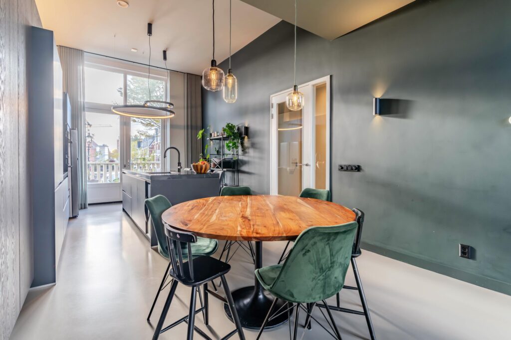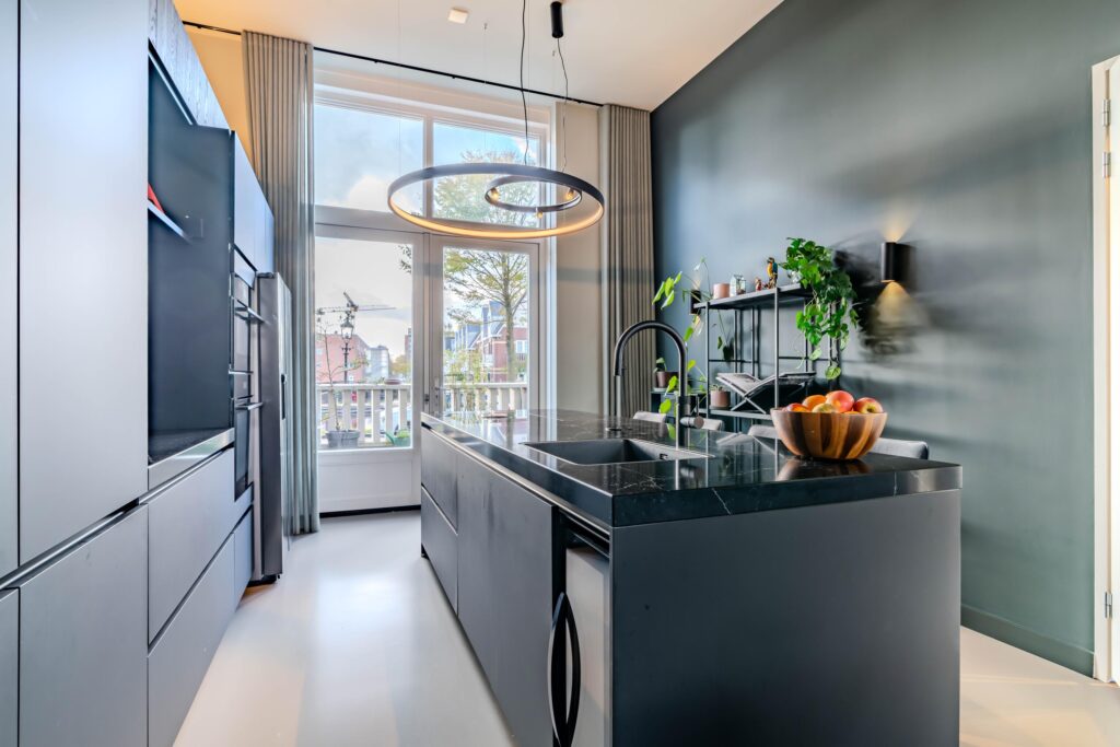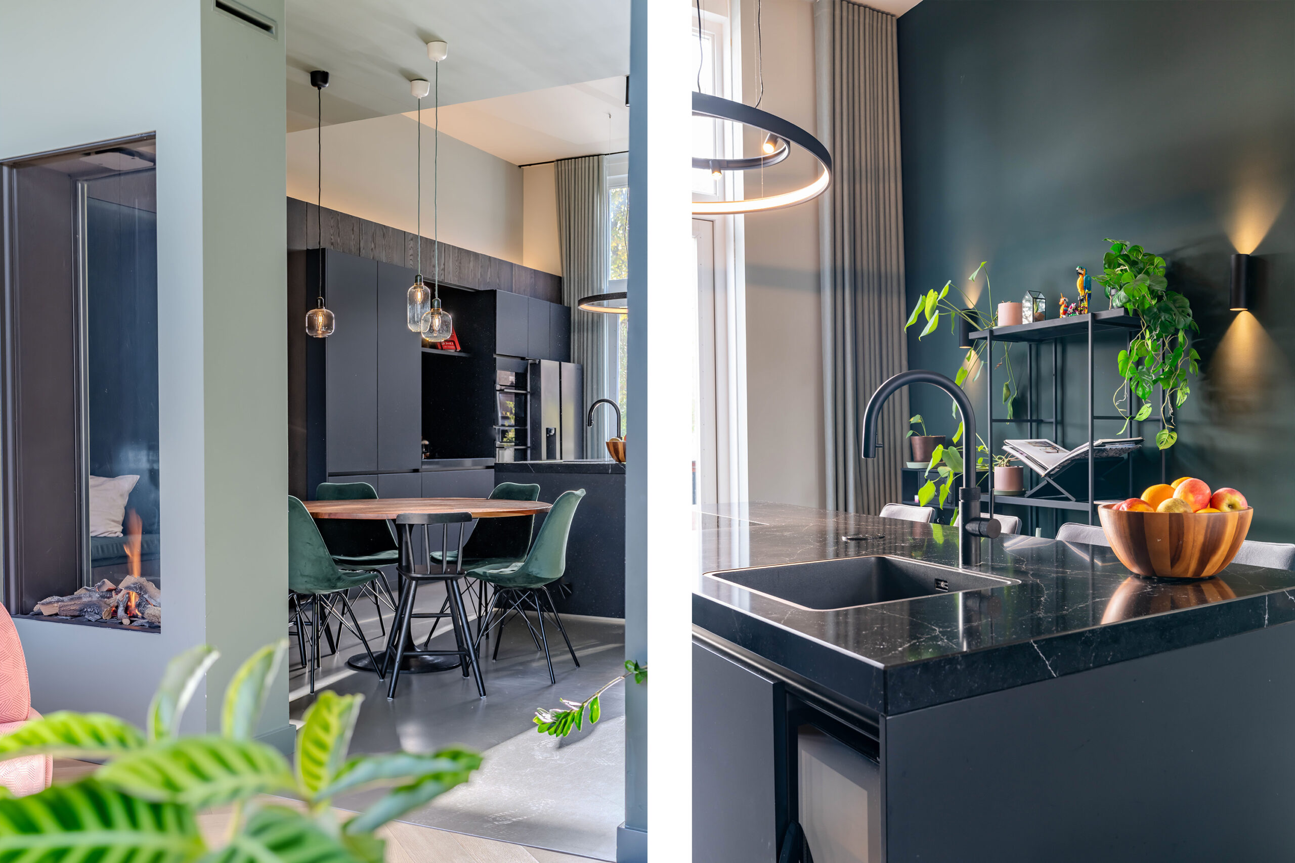 Bij binnenkomst valt direct de ruime woonkeuken op, aan de voorzijde van de woning. Deze is voorzien van alle hedendaagse moderne apparatuur en vormt met het gezellige eetgedeelte en de bar het hart van het huis. Via de open indeling loop je zo door naar de woonkamer aan de achterzijde, die door een stijlvolle open haard op natuurlijke wijze wordt gescheiden van de keuken. De woonkamer straalt rust en klasse uit dankzij de maatwerk inbouwkasten, het hoge plafond en de grote raampartijen die zorgen voor een prachtige lichtinval. De visgraatvloer in het woongedeelte en de gietvloer in de keuken geven het geheel een luxe en eigentijdse uitstraling.