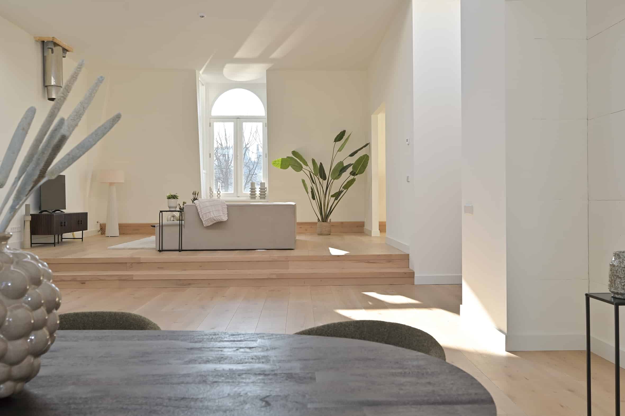 The living area forms the heart of the home and immediately impresses with its size and possibilities. There is ample space here to create a luxurious open kitchen tailored entirely to your lifestyle. All connections have already been renewed and are in place. At the front, there is an elevated seating area, perfect for long evenings overlooking the city, optionally with a cozy fireplace.