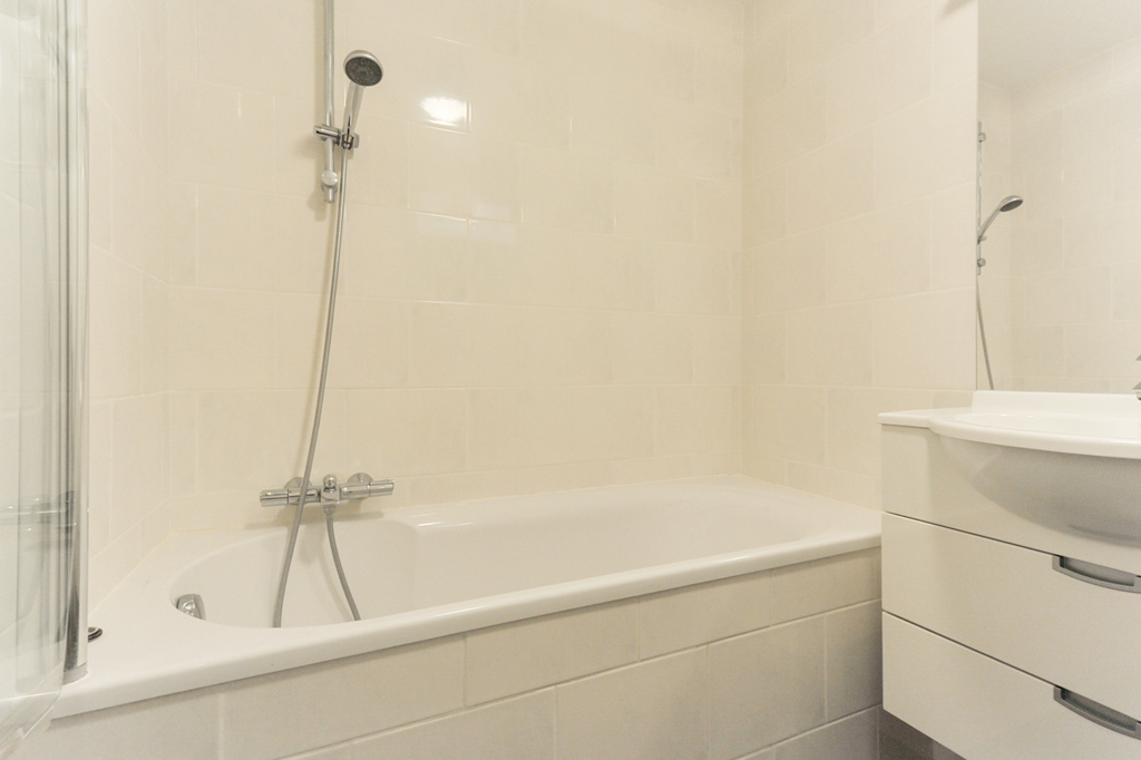 study/landing with Veluxwindow, two bedrooms with access to a large balcony facing South West, modern bathroom with bath/shower, toilet, washbasin and towel heater.