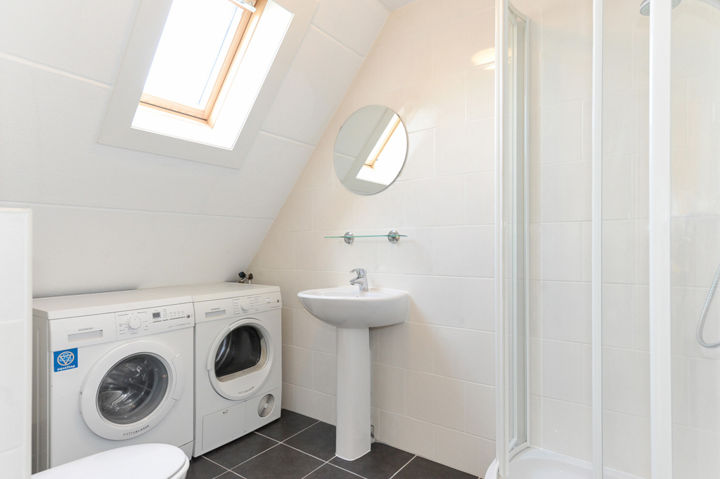Overloop, twee ruime slaapkamers, tweede badkamer met douche, toilet en wasmachine/droger.