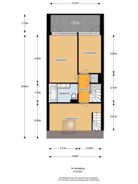 Studeerkamer/overloop met Velux dakraam, twee slaapkamers met toegang tot een groot balkon op het zuidwesten, moderne badkamer met bad/douche, toilet, wastafel en handdoekradiator.