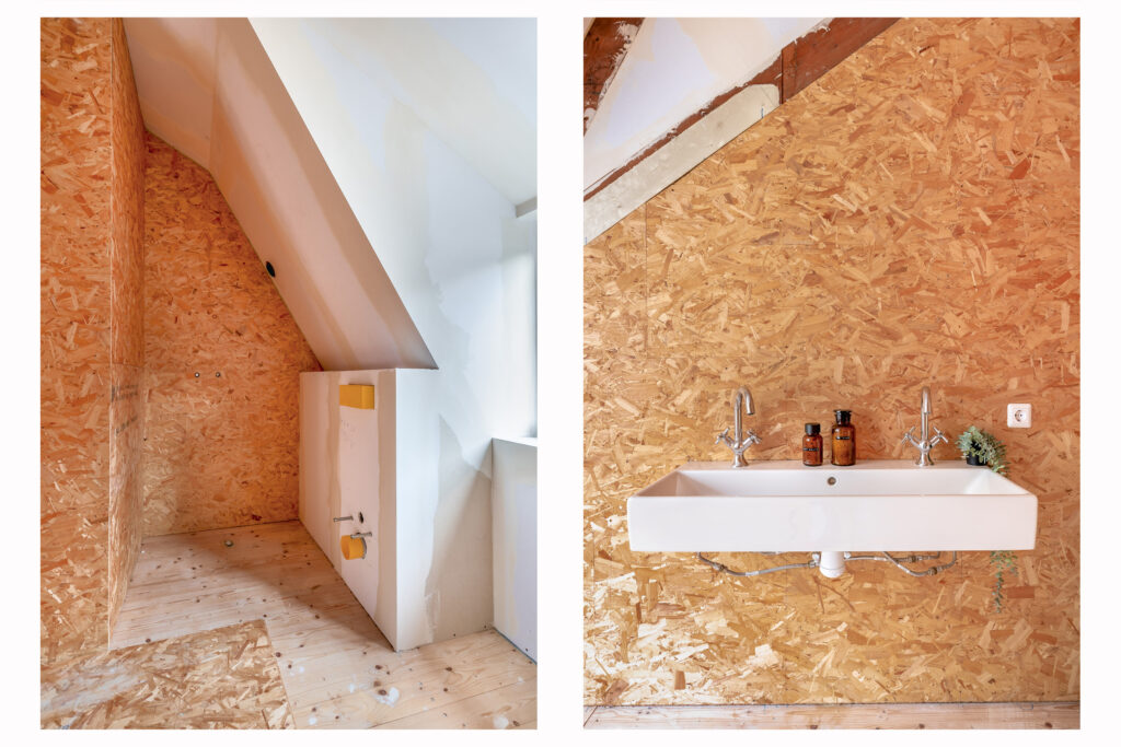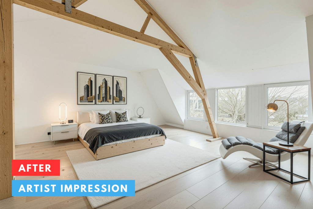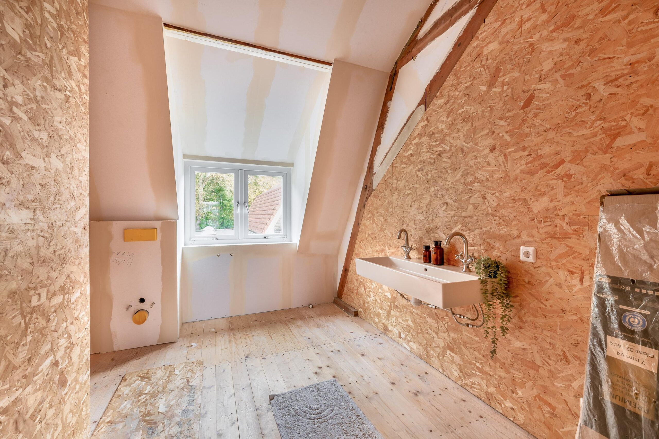 De 1e verdieping bestaat nu uit één royale open ruimte en een aparte badkamer.