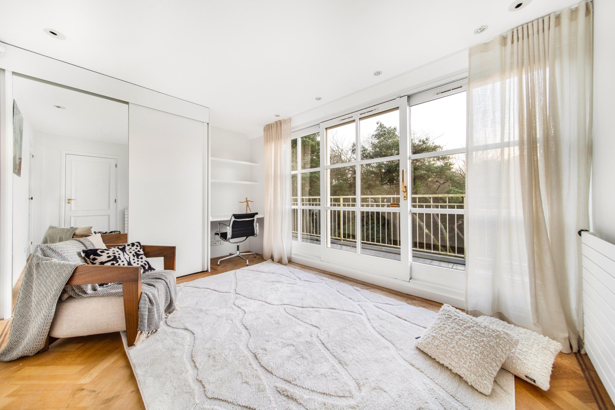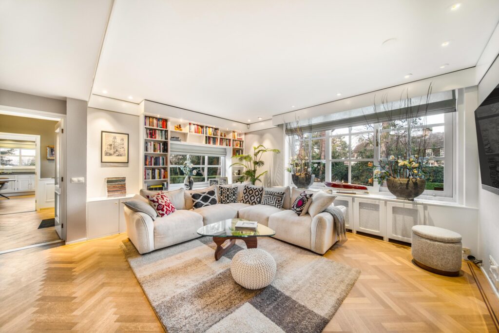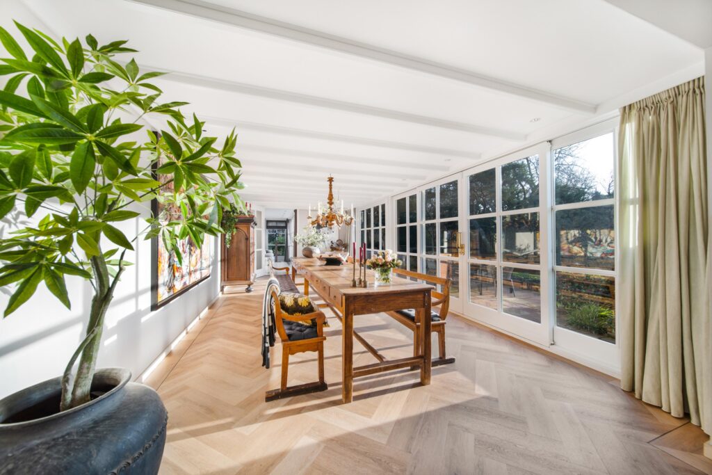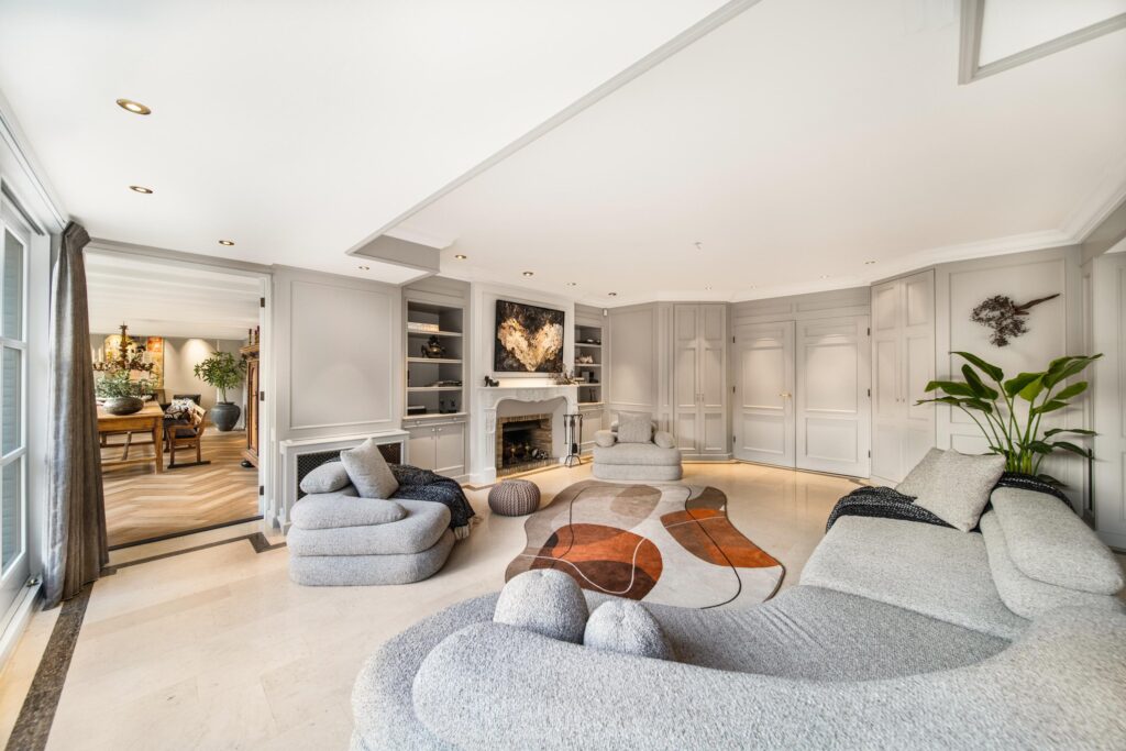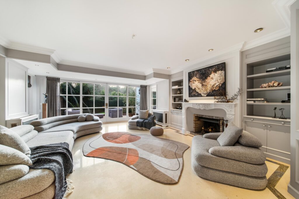 The garden room (dining room) and the salon are south-facing and, thanks to full-width sliding doors, enjoy beautiful natural light and direct access to the terraces and garden, allowing indoor and outdoor living to blend seamlessly. Both rooms are further enhanced by open fireplaces, adding warmth and ambiance. Adjacent to these spaces is a separate TV room that flows into a study with an open fireplace—ideal for those seeking a quiet place to work or relax, whether for professionals working from home or families requiring multiple living functions side by side.