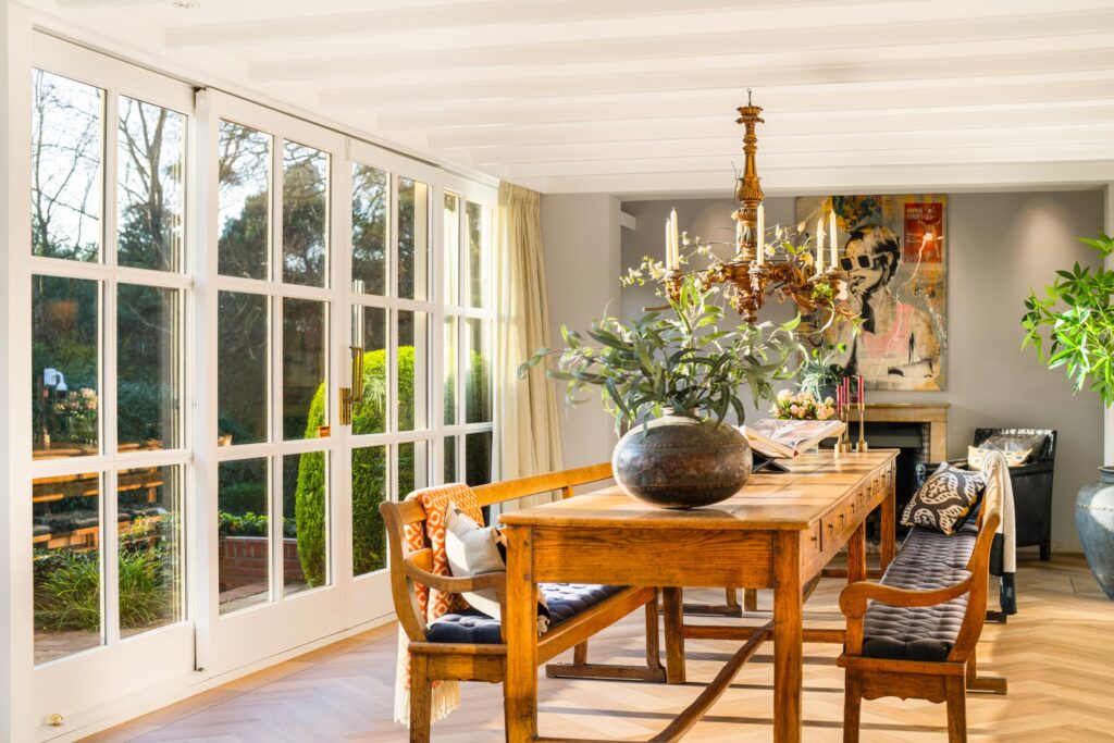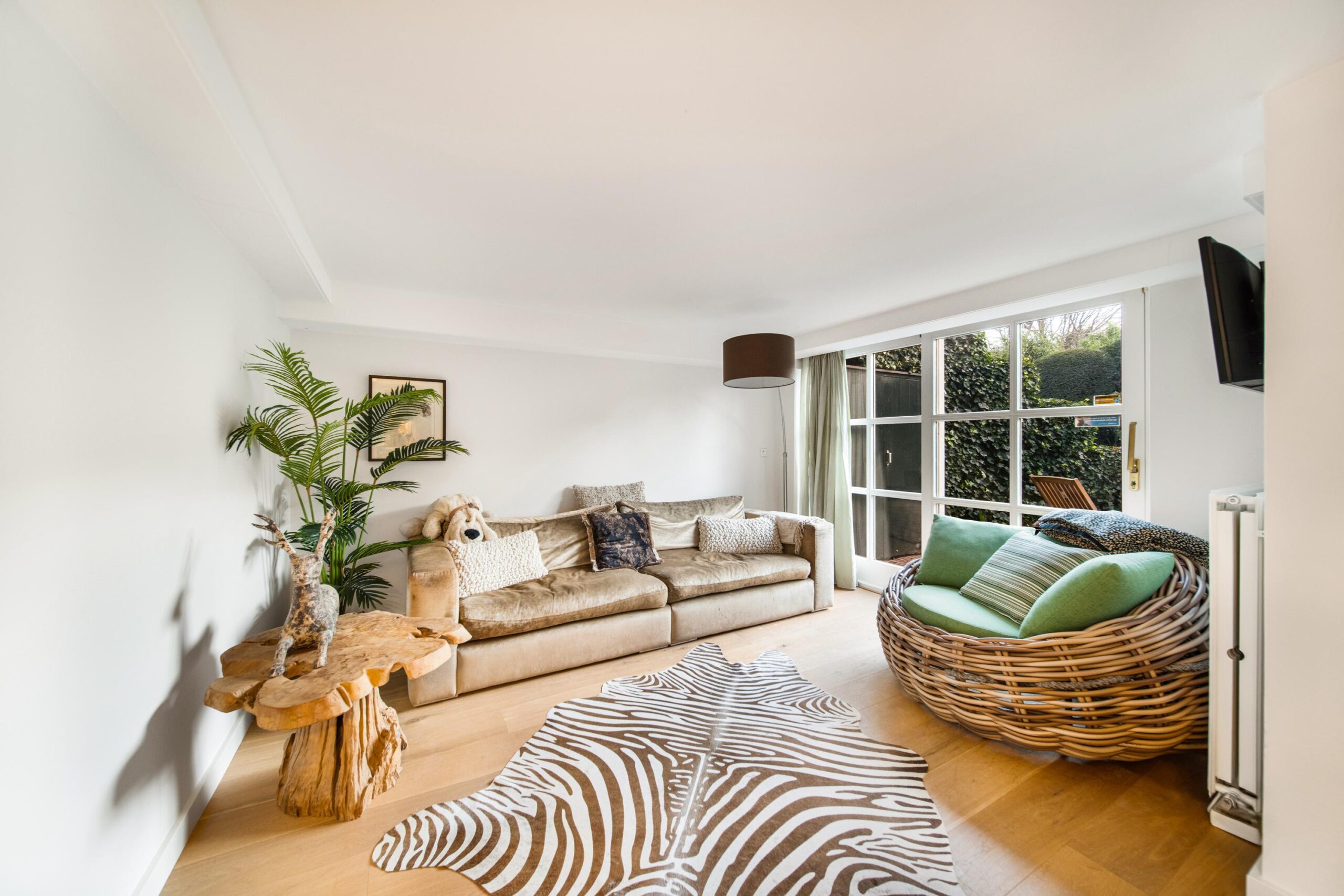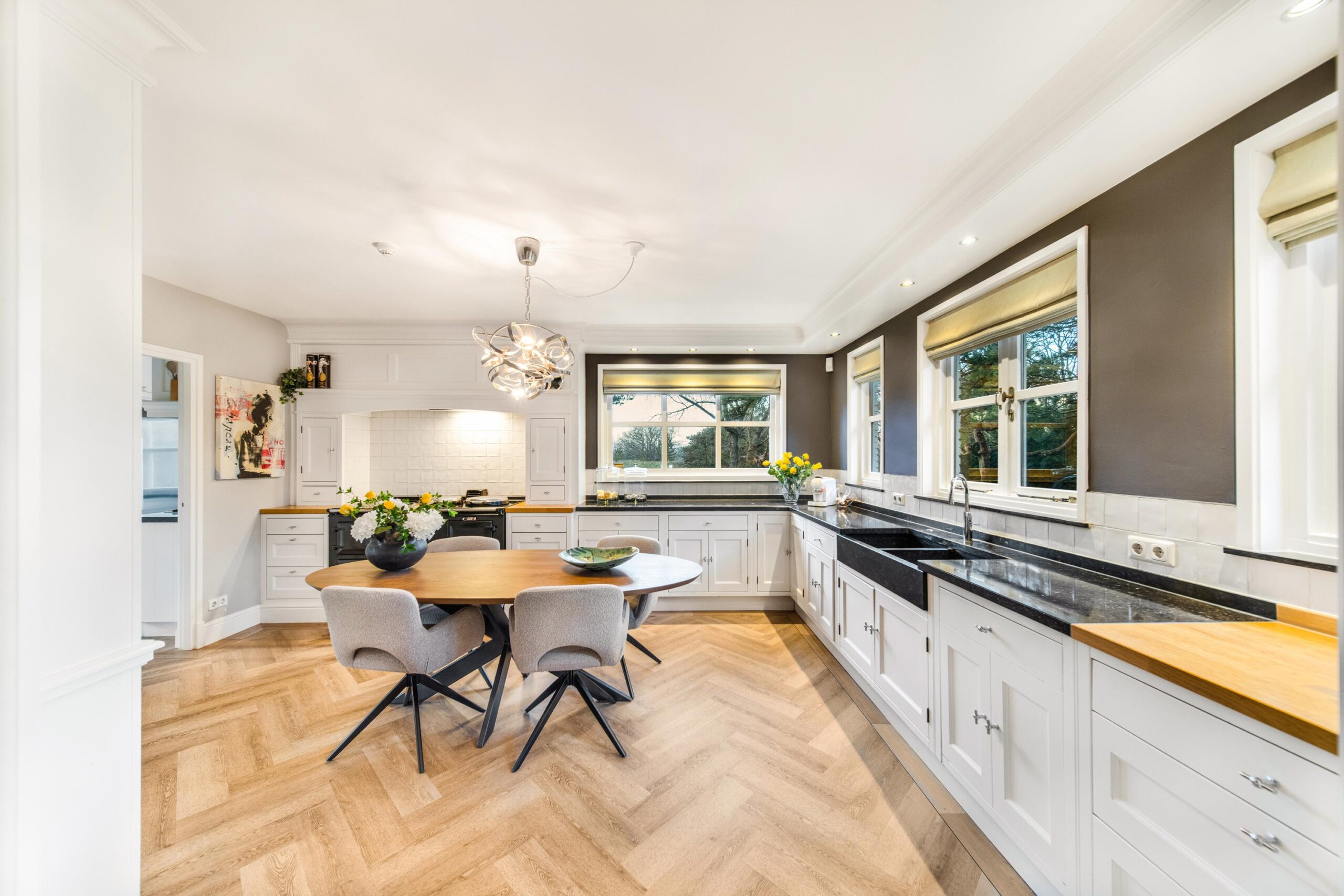 De tuinkamer (eetkamer) en de salon liggen op het zuiden en hebben dankzij de kamerbrede schuifpuien prachtig licht en directe toegang tot terrassen en tuin, waardoor binnen- en buitenleven harmonieus in elkaar overvloeien. Beide ruimtes worden extra sfeervol door de aanwezigheid van open haarden. Aansluitend bevindt zich een aparte tv-kamer die doorloopt naar een werkkamer met open haard: ideaal voor wie een rustige werk- of ontspanningsplek zoekt, zowel voor thuiswerkende professionals als voor gezinnen waar verschillende woonfuncties naast elkaar moeten kunnen bestaan.
