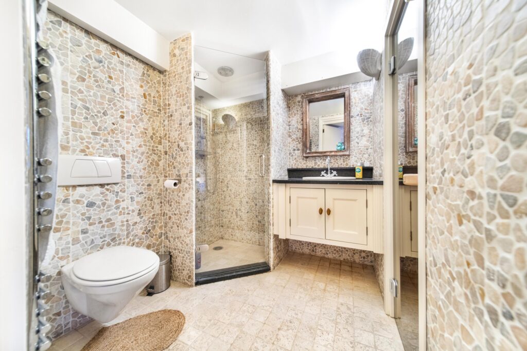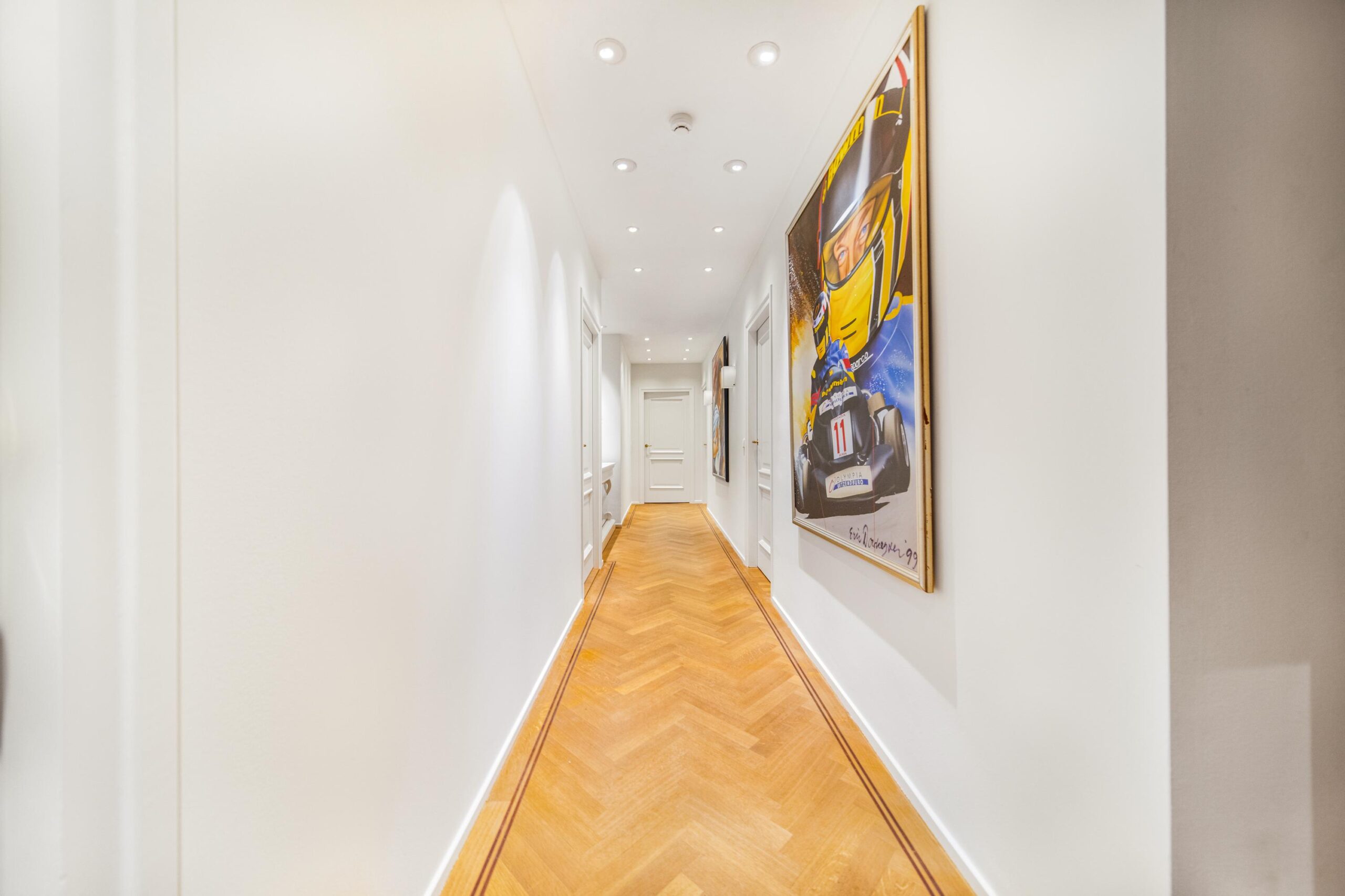 In the basement, there is a fully self-contained guesthouse with its own entrance, living room, bedroom, bathroom with toilet, and sauna. This makes the villa particularly suitable for hosting guests, accommodating live-in family members, or a nanny. The basement also houses a wine cellar, a spacious laundry room, a technical room, and two internal garages with space for a total of four cars, including an additional shower with toilet.