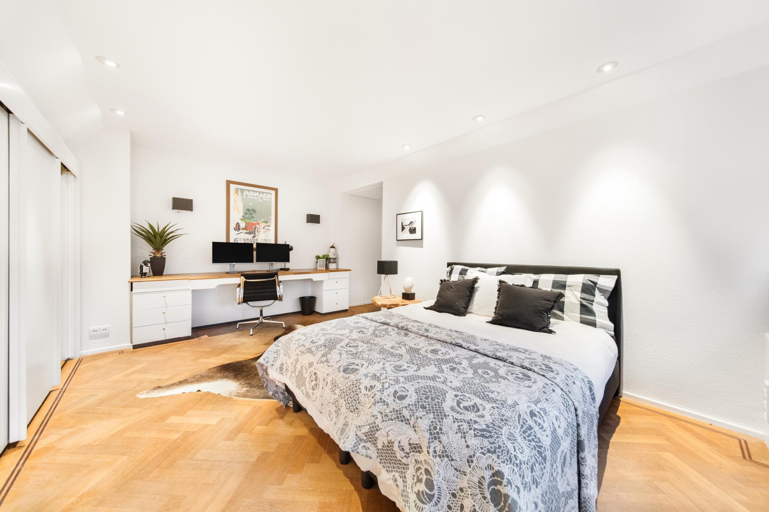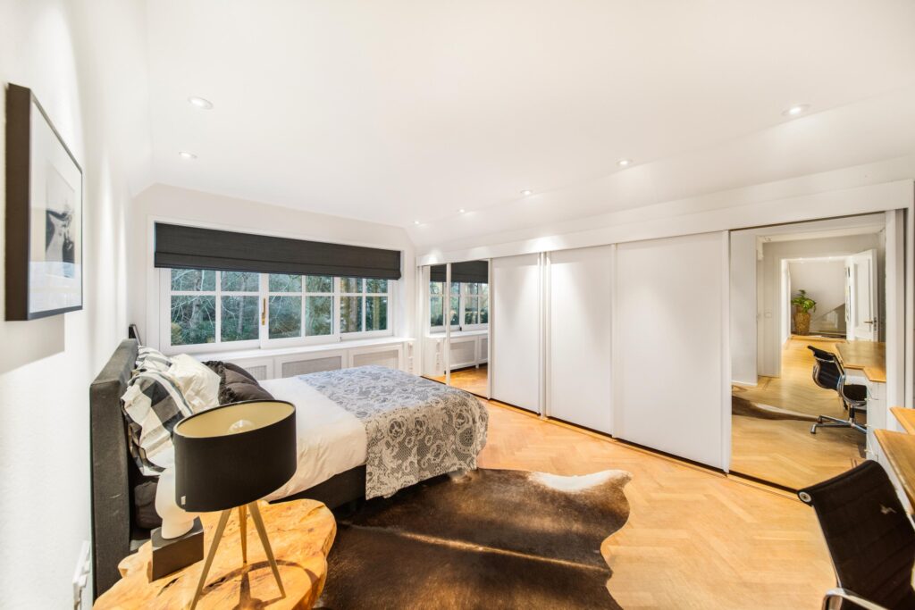 Single-level living is possible thanks to the spacious master bedroom on the ground floor, featuring walk-in closets and a luxurious bathroom. On the first floor, there are four bedrooms, each with its own bathroom and toilet—an ideal setup for larger families or international families accustomed to ensuite living. From this floor, there is also access to a sunny terrace overlooking the green, tranquil surroundings.