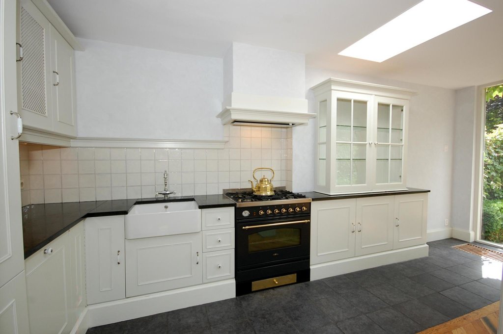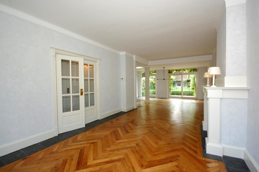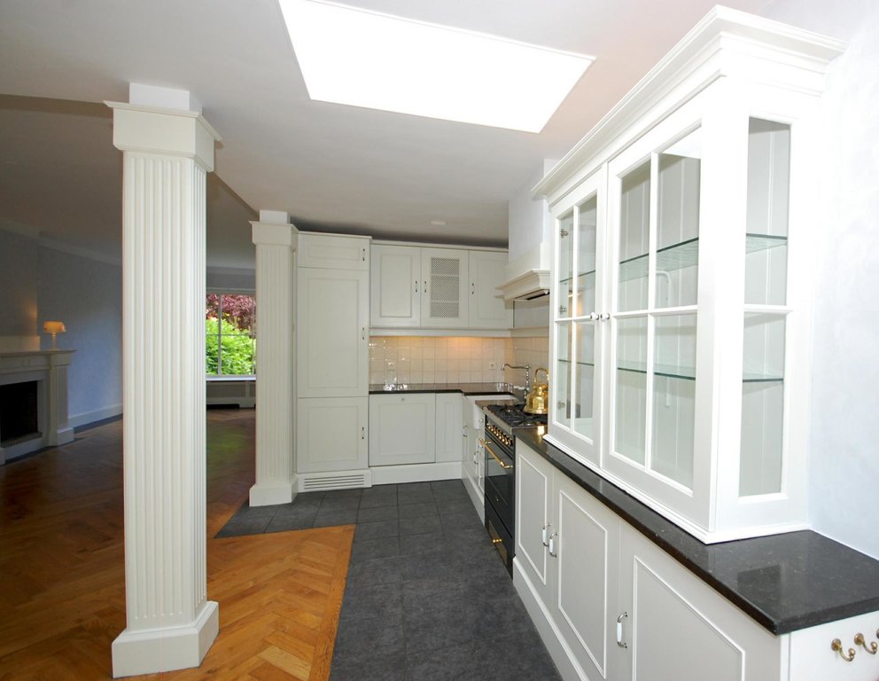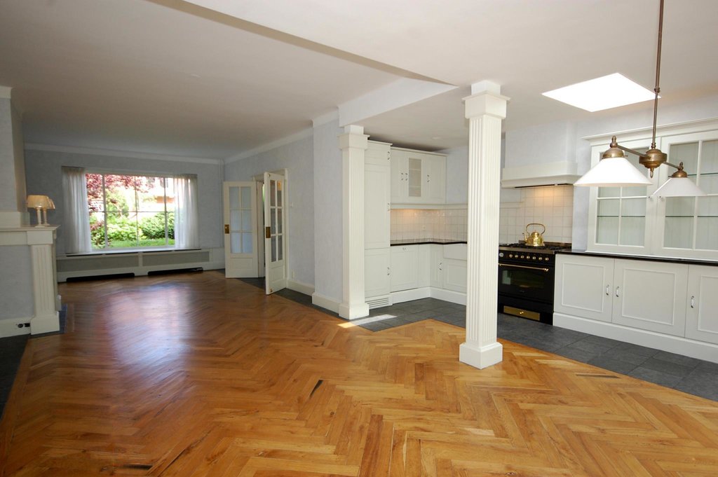 entree met hardstenen vloer, ruim toilet met fonteintje, dubbele openslaande deuren naar de uitgebouwde woonkamer van circa 40 m² met open haard op gas, eikenhouten vloerbedekking en open keuken voorzien van alle inbouwapparatuur. Een schuifpui geeft toegang tot de achtertuin.