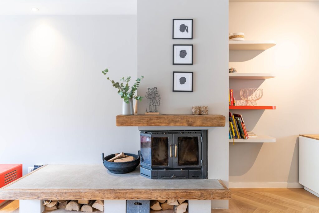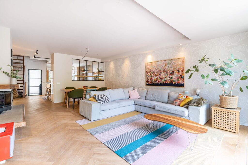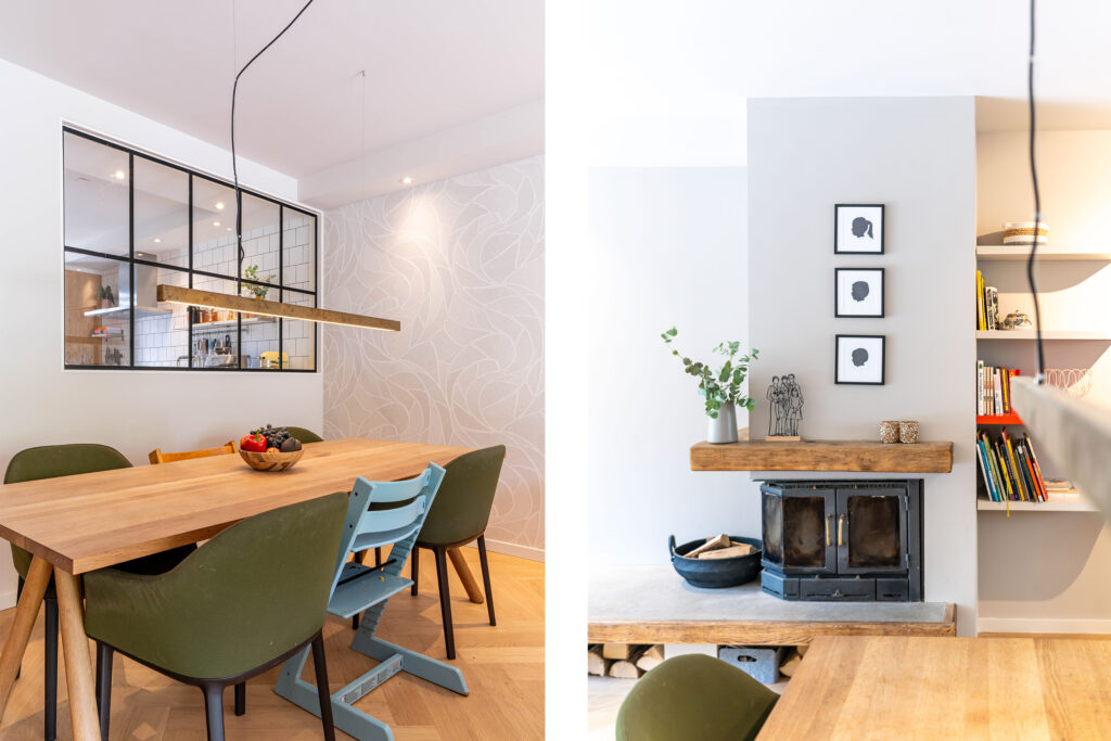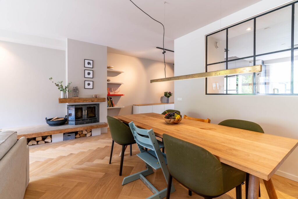 Binnen wordt meteen duidelijk dat dit een huis is waar goed over nagedacht is. De begane grond straalt warmte uit met een prachtige visgraat parketvloer en een open haard die uitnodigt tot lange avonden met het gezin of vrienden. De moderne open keuken is het hart van de woning, perfect voor wie graag kookt terwijl de kinderen hun huiswerk maken of er gewoon gezellig bij zitten. De begane grond is bovendien volledig opnieuw gestuct en afgewerkt met dimbare spots, waardoor je in de woonkamer precies de juiste sfeer kunt creëren.