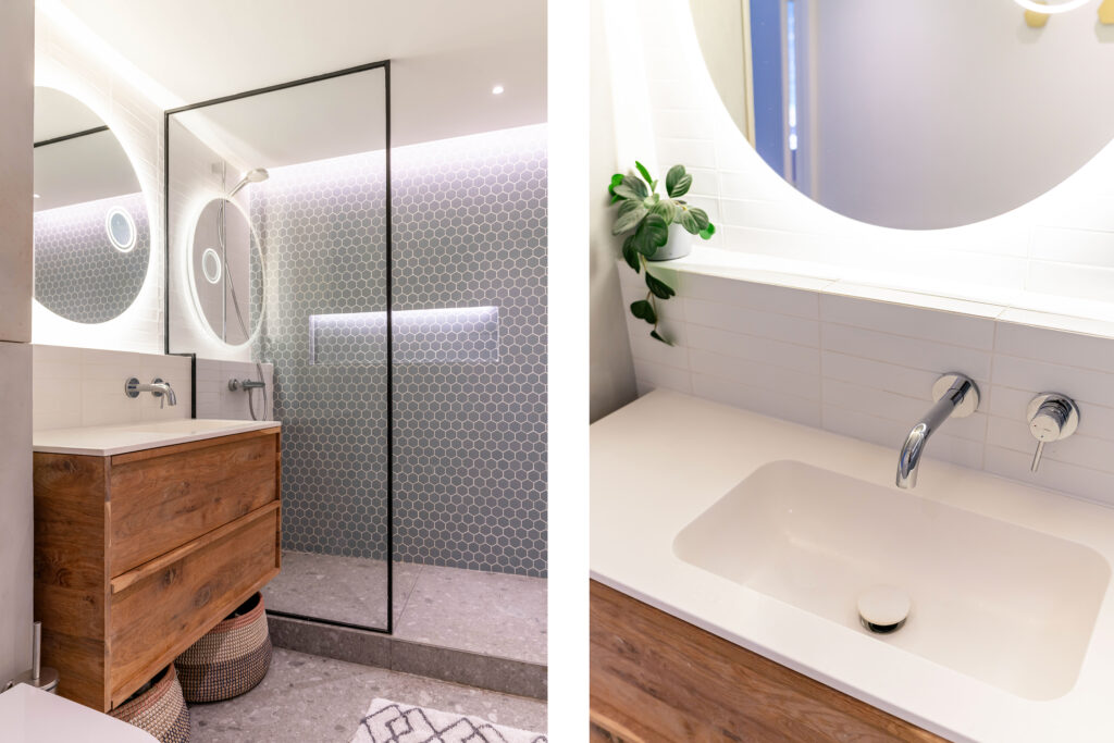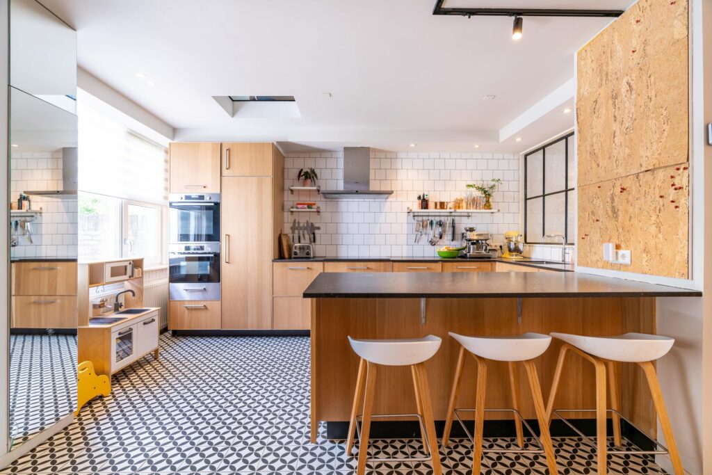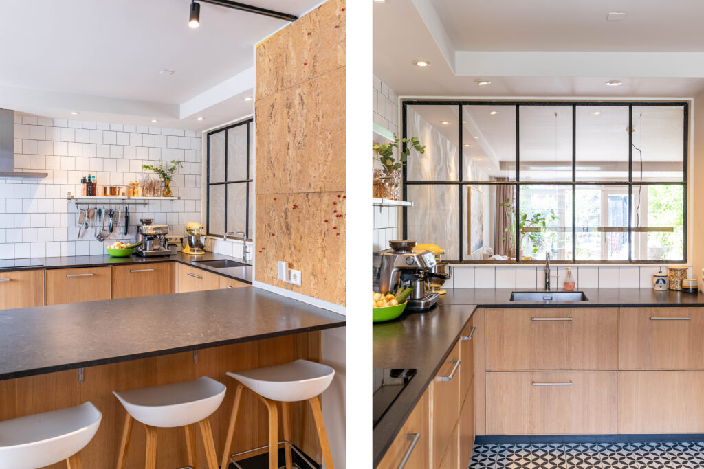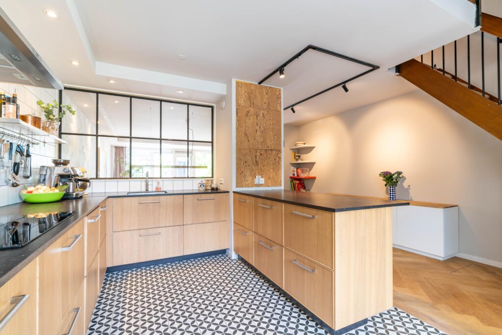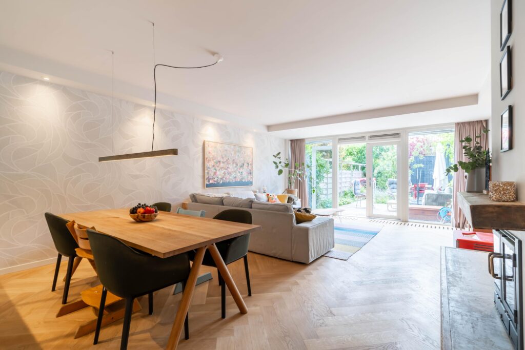 Binnen wordt meteen duidelijk dat dit een huis is waar goed over nagedacht is. De begane grond straalt warmte uit met een prachtige visgraat parketvloer en een open haard die uitnodigt tot lange avonden met het gezin of vrienden. De moderne open keuken is het hart van de woning, perfect voor wie graag kookt terwijl de kinderen hun huiswerk maken of er gewoon gezellig bij zitten. De begane grond is bovendien volledig opnieuw gestuct en afgewerkt met dimbare spots, waardoor je in de woonkamer precies de juiste sfeer kunt creëren.