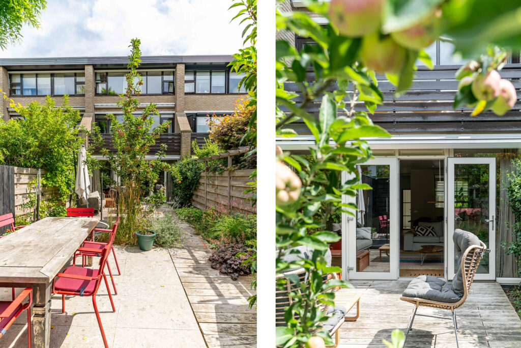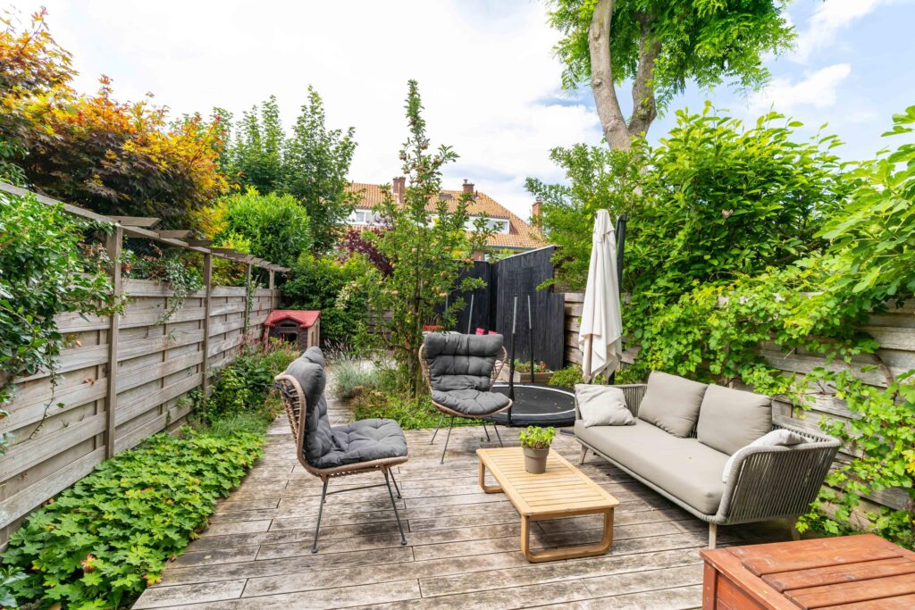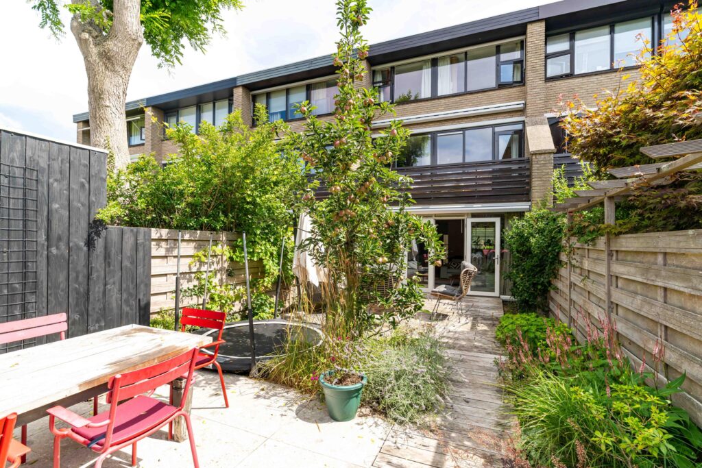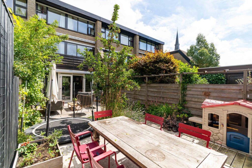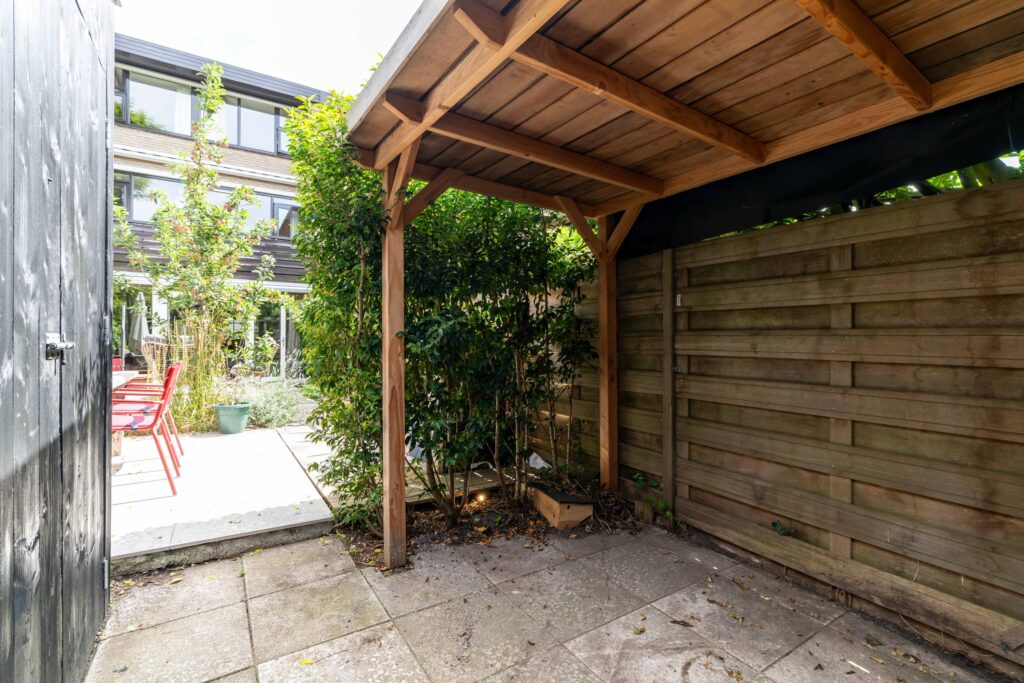 The garden faces sunny southwest, so you can enjoy the sun all afternoon and evening. The terrace has space for a comfortable lounge set, perfect for relaxing with a drink, while a separate dining area is ideal for long summer evenings. At the back of the garden, you’ll find a practical storage shed and a covered area, perfect for keeping bikes dry and everything neatly stored.