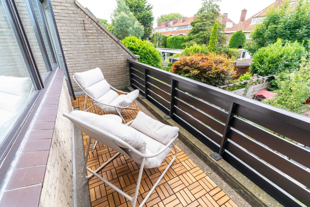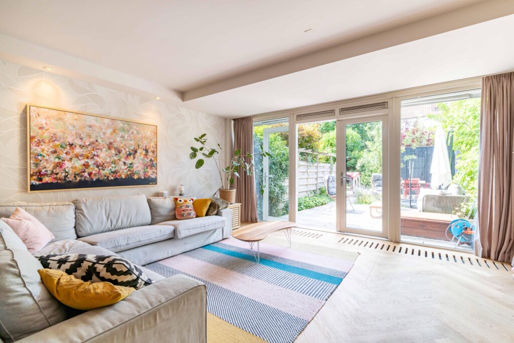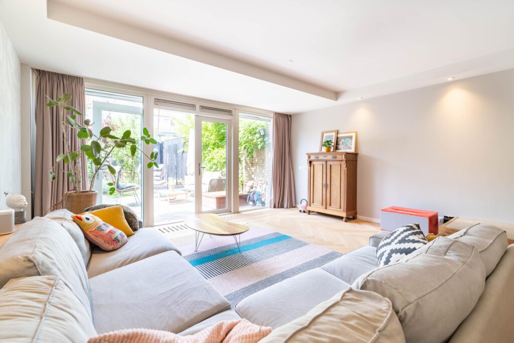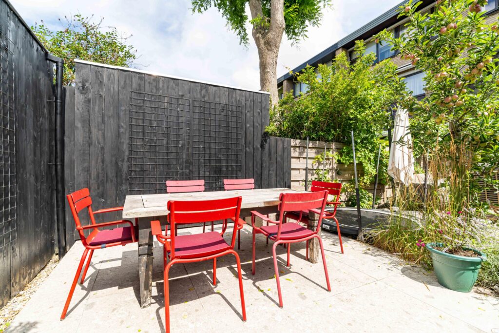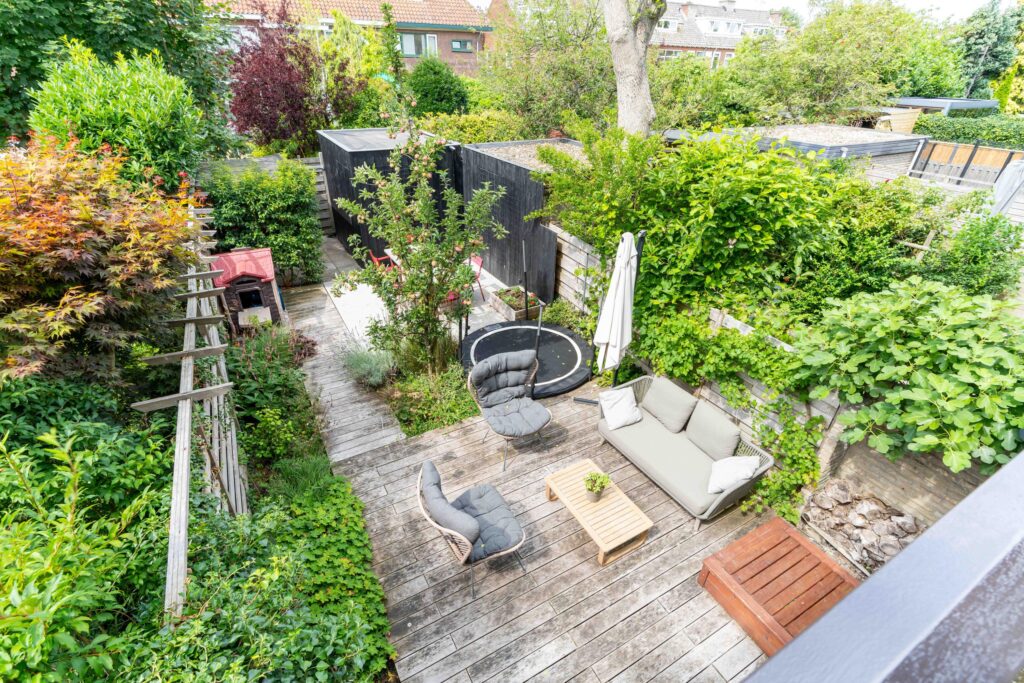 The garden faces sunny southwest, so you can enjoy the sun all afternoon and evening. The terrace has space for a comfortable lounge set, perfect for relaxing with a drink, while a separate dining area is ideal for long summer evenings. At the back of the garden, you’ll find a practical storage shed and a covered area, perfect for keeping bikes dry and everything neatly stored.