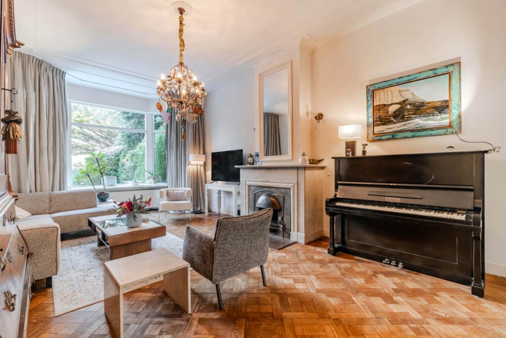 Met een royale woonoppervlakte van maar liefst 301 m² voelt dit huis direct groots en comfortabel aan. Je komt binnen in een indrukwekkende hal met een stijlvolle granieten vloer die meteen de toon zet. De woonkamer en-suite is een echte blikvanger, met authentieke glas-in-looddeuren, een warme houten vloer en een open haard die zorgt voor extra gezelligheid. Ook in de eetkamer is een open haard aanwezig en samen met de originele ornamenten ademt deze leefruimte pure charme. Vanuit hier loop je door naar de keuken, die van alle gemakken is voorzien en perfect aansluit bij het dagelijkse gezinsleven.