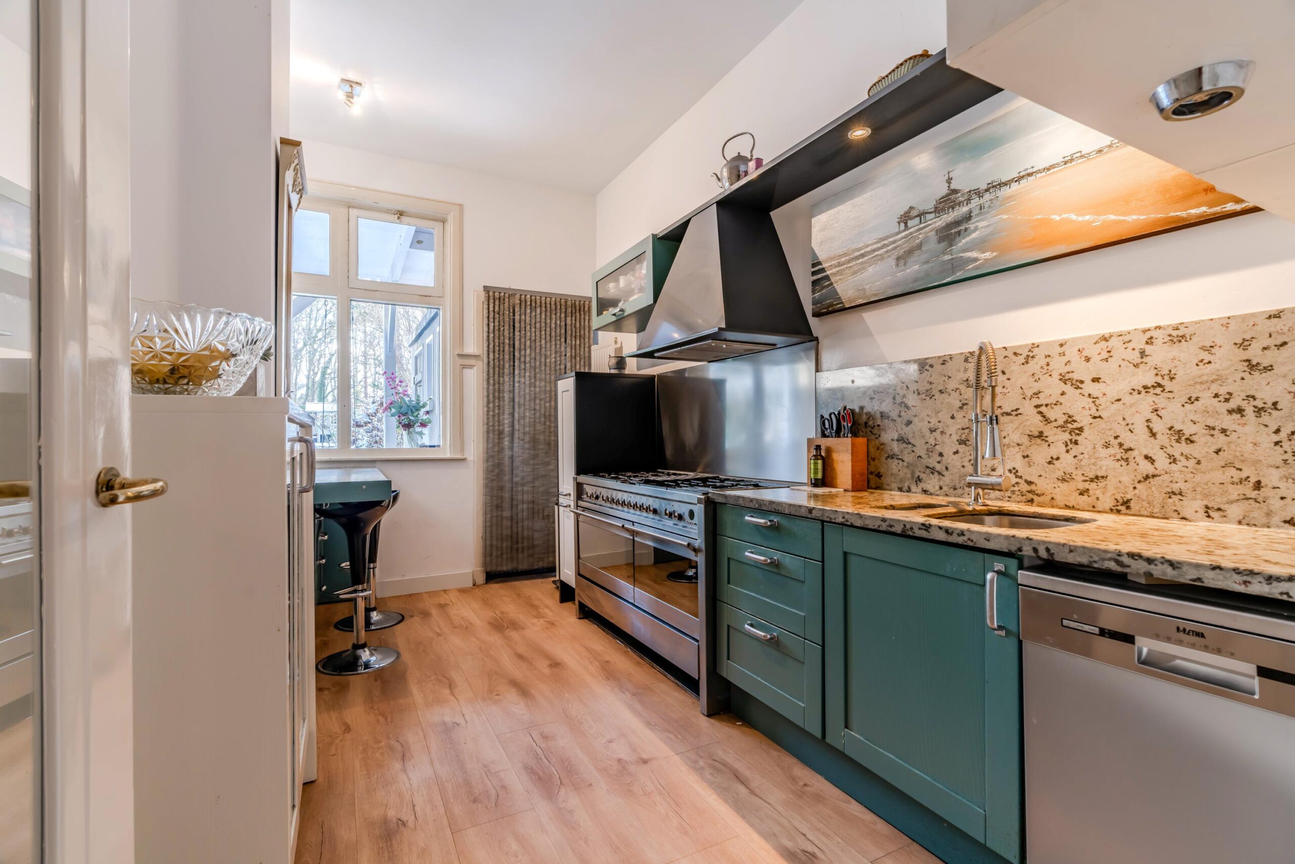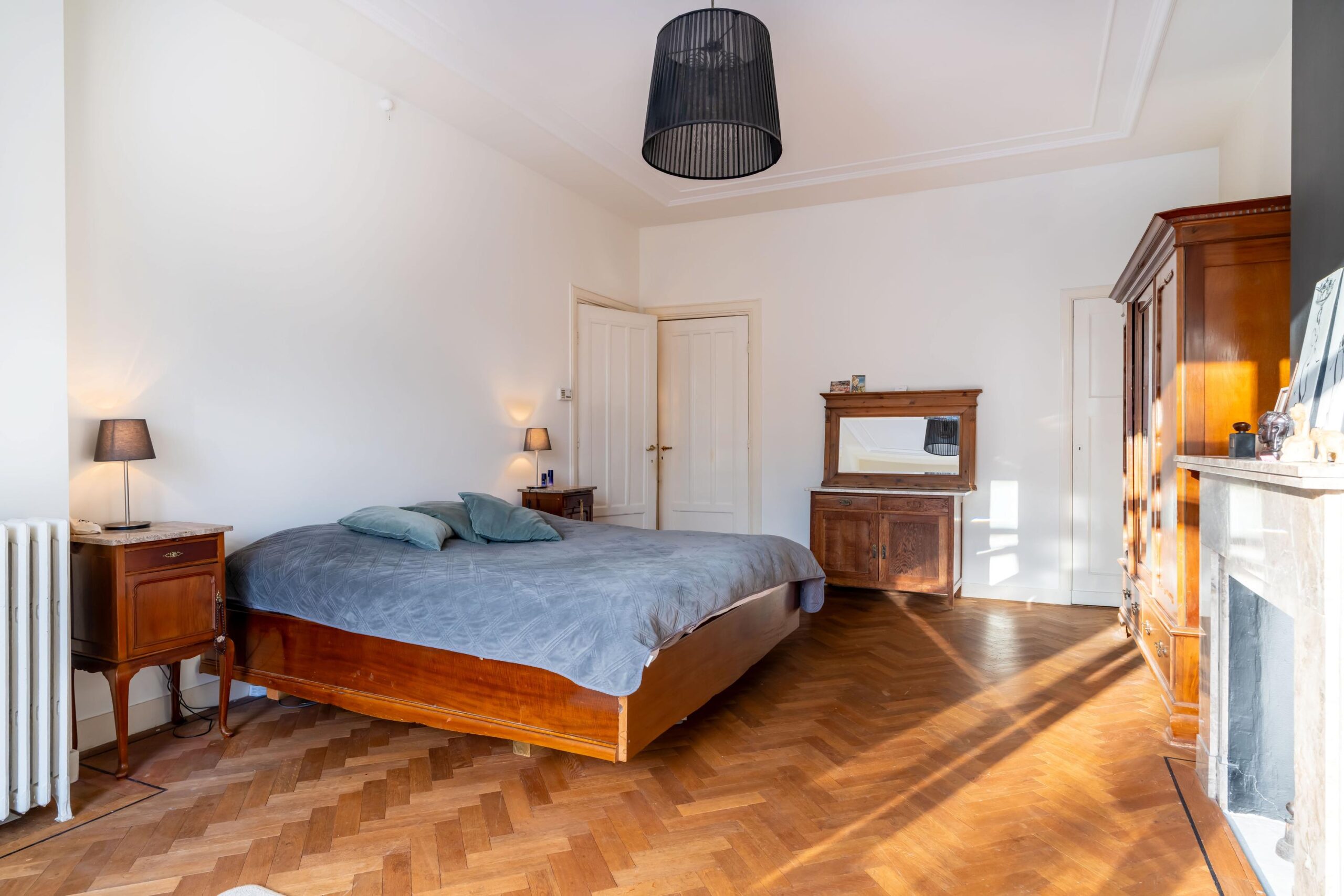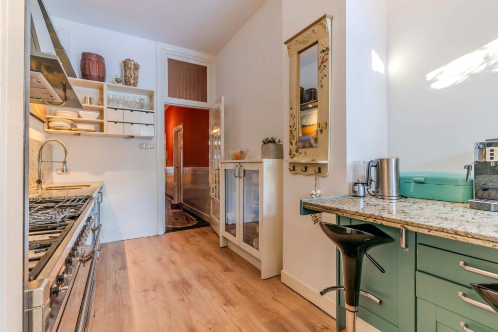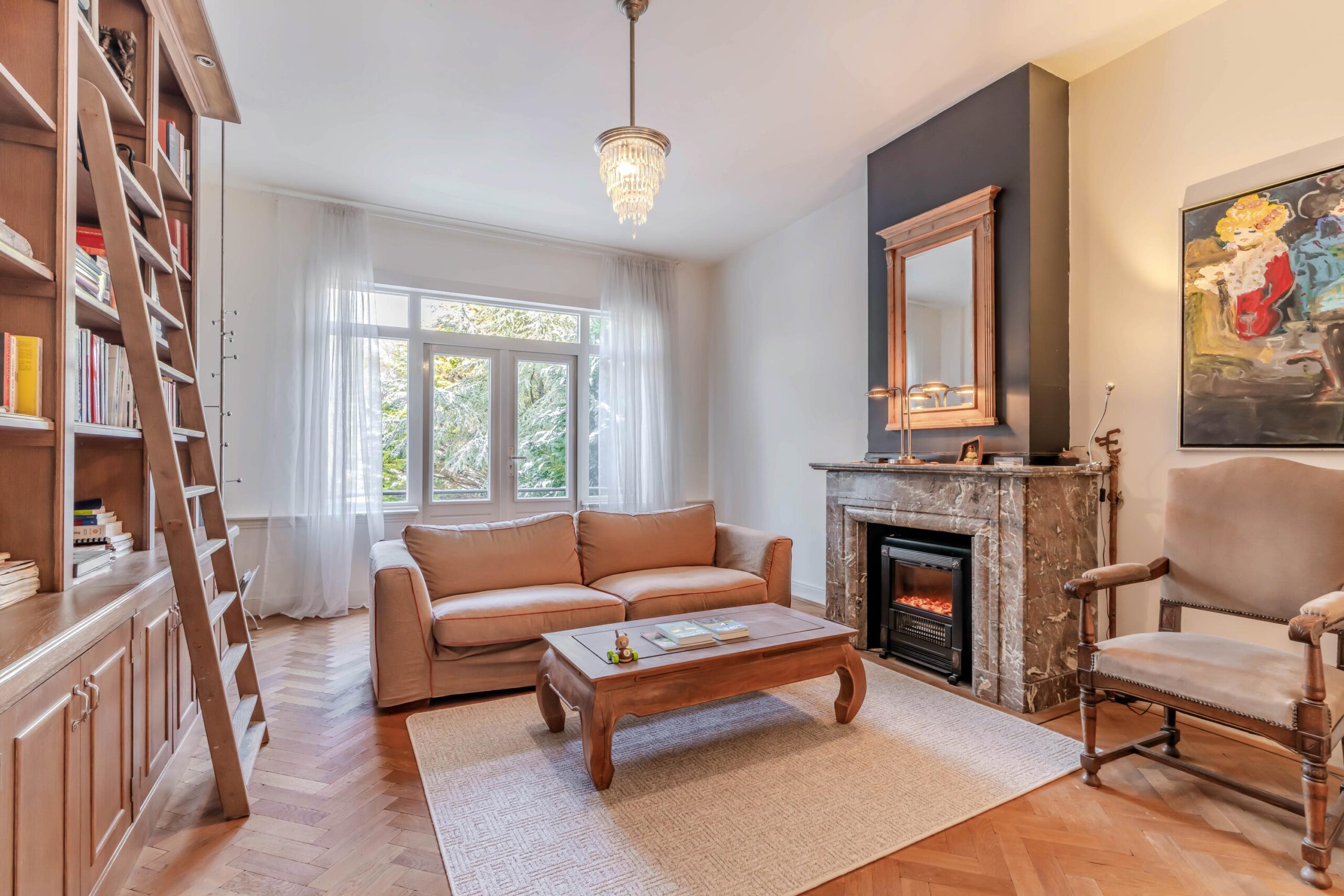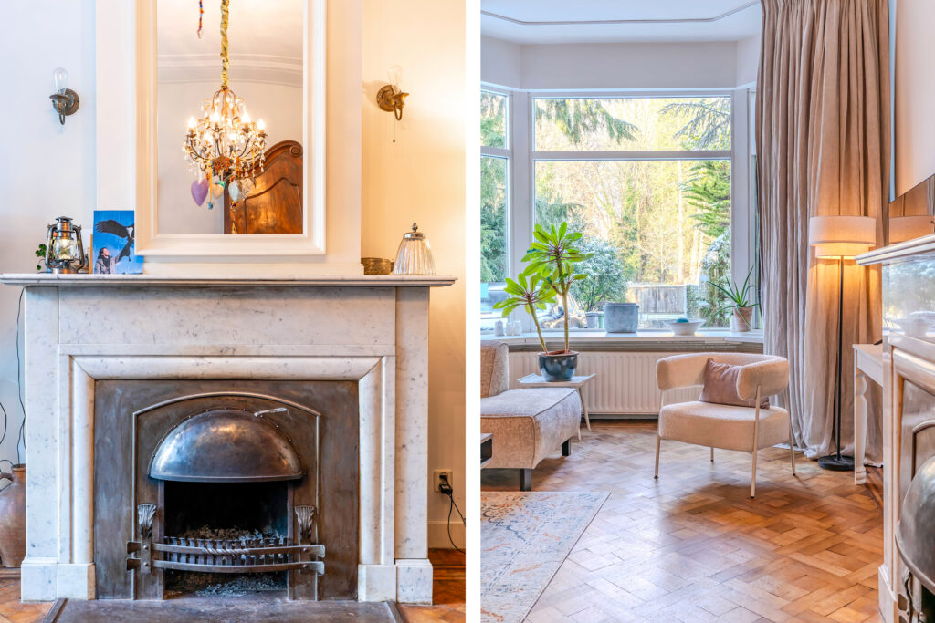 With a generous living area of no less than 301 m², this house immediately feels spacious and comfortable. You enter through an impressive hallway with a stylish granite floor that sets the tone right away. The en-suite living room is a real eye-catcher, featuring authentic stained-glass doors, a warm wooden floor, and a fireplace that adds extra coziness. The dining room also has a fireplace, and together with the original decorative details, this living space exudes pure charm. From here, you walk through to the kitchen, which is fully equipped and perfectly suited to everyday family life.