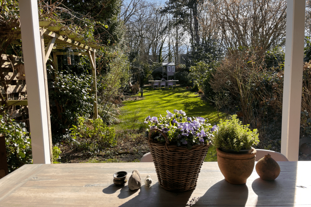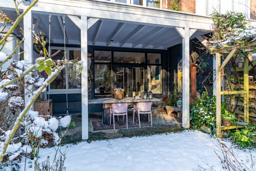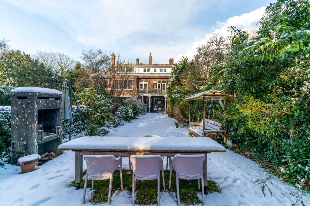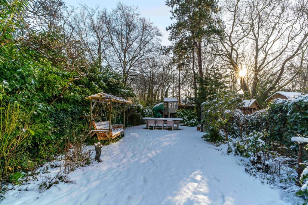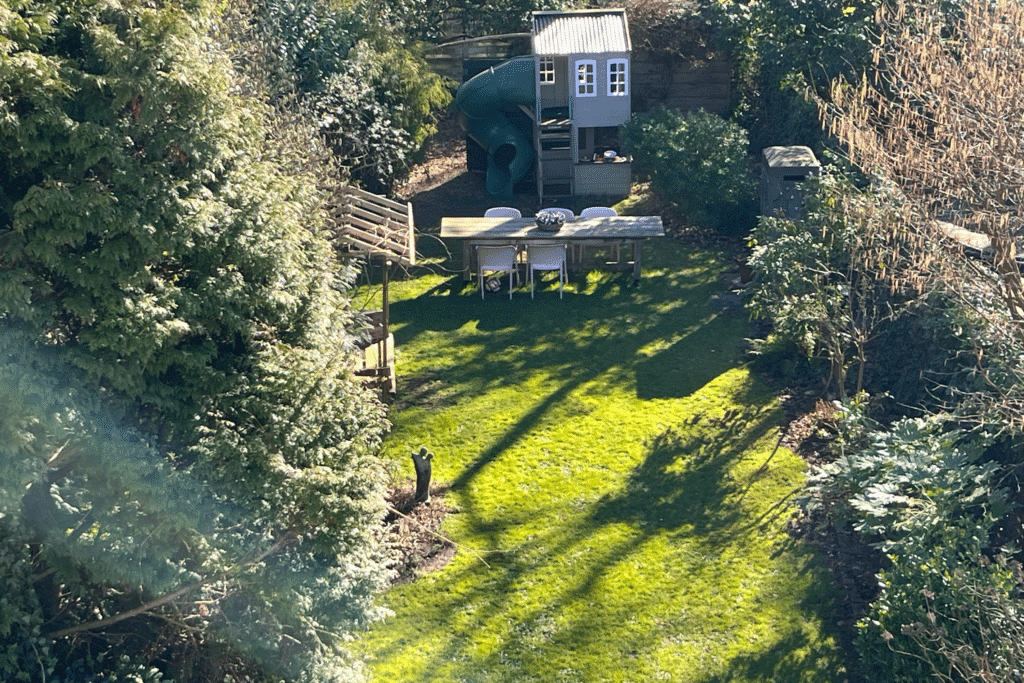 Direct aan het huis bevindt zich een gezellig eetgedeelte onder de overkapping, een heerlijke plek om lange avonden door te brengen. De tuin is zeer diep en biedt volop privacy, waardoor hij ideaal is voor spelende kinderen, met ruimte voor bijvoorbeeld een schommel of speeltoestel. Achterin de tuin vind je een tweede eetgedeelte met een sfeervolle buitenhaard, waardoor je hier op elk moment van de dag kunt genieten.