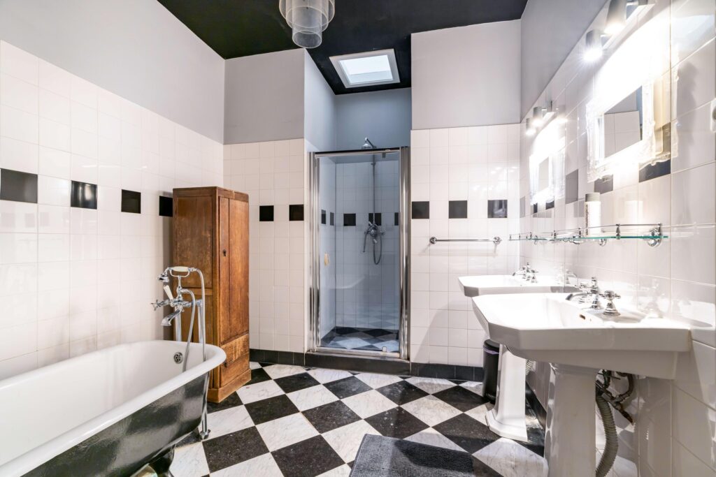 On the first floor, there are two spacious bedrooms, both with their own fireplace, creating a distinctive and luxurious atmosphere. In addition, there is a pleasant home office and a very spacious bathroom with a shower, a bathtub, and a double vanity, making comfort and relaxation key features of this floor.