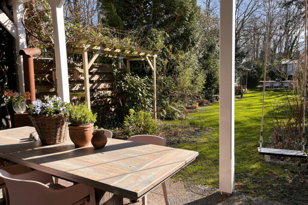 - Zeer diepe achtertuin (circa 36 meter diep) met eetgedeelte onder de overkapping;