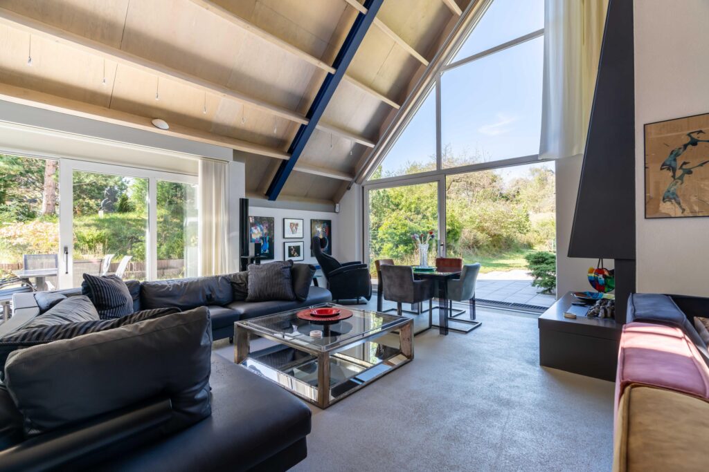 The spacious hall with cloakroom and guest toilet opens to a bright, open living space with distinct areas for dining, relaxing, and cozy evenings by the fireplace. The high ceiling and open loft create an impressive sense of volume and light.