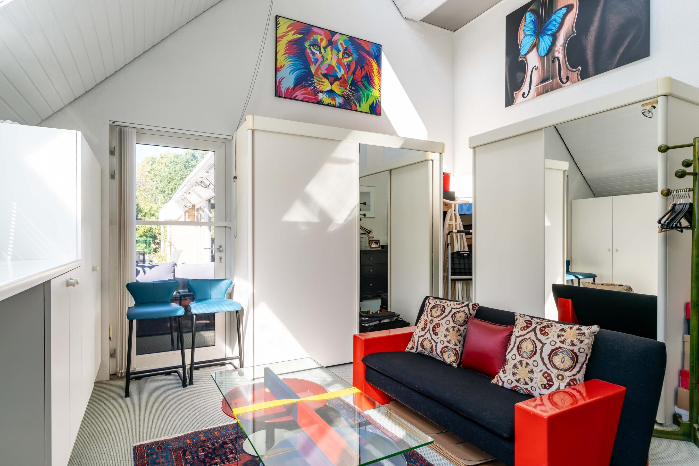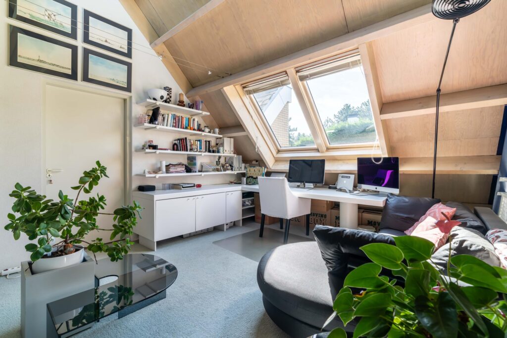 Via de eethoek leidt een trap naar de vide, momenteel ingericht als werkkamer, met toegang tot een extra slaapkamer met balkon.