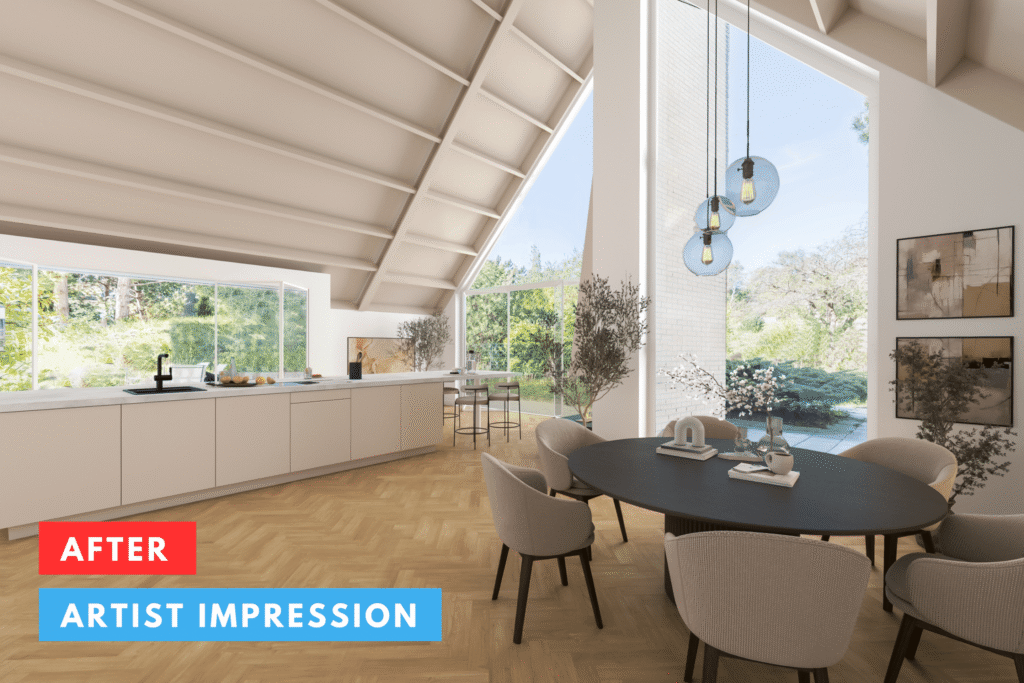 De ruime hal met garderobe en gastentoilet geeft toegang tot de lichte, open woonkamer met verschillende zones voor dineren, ontspannen en gezellige avonden bij de open haard. De hoge plafonds en open vide zorgen voor een indrukwekkend gevoel van licht en ruimte.