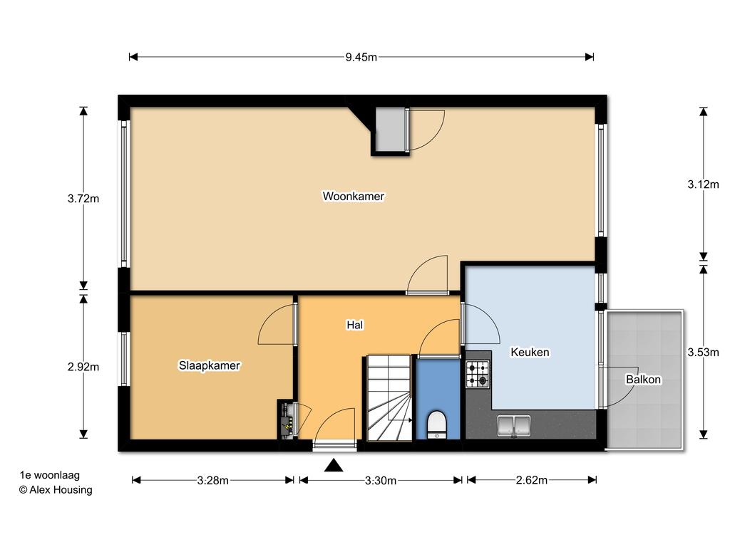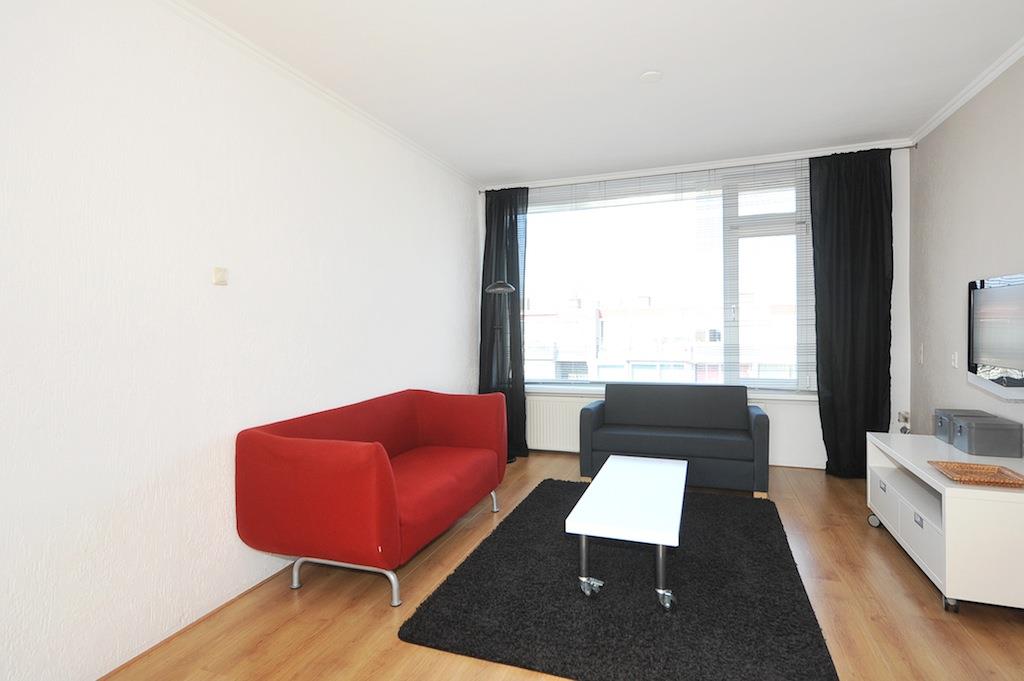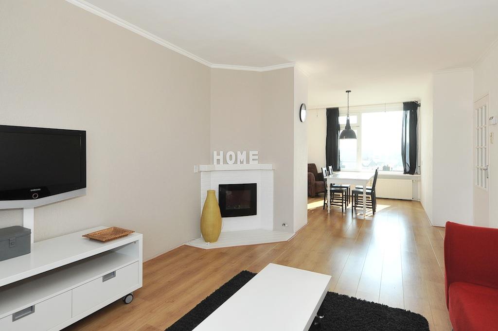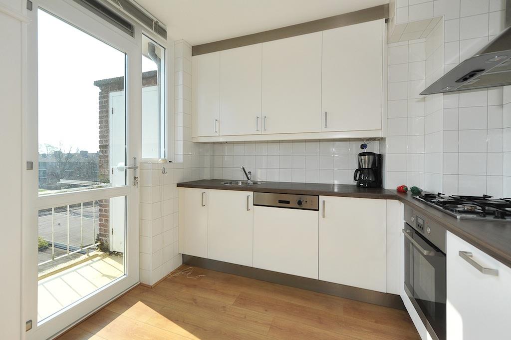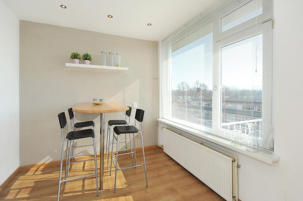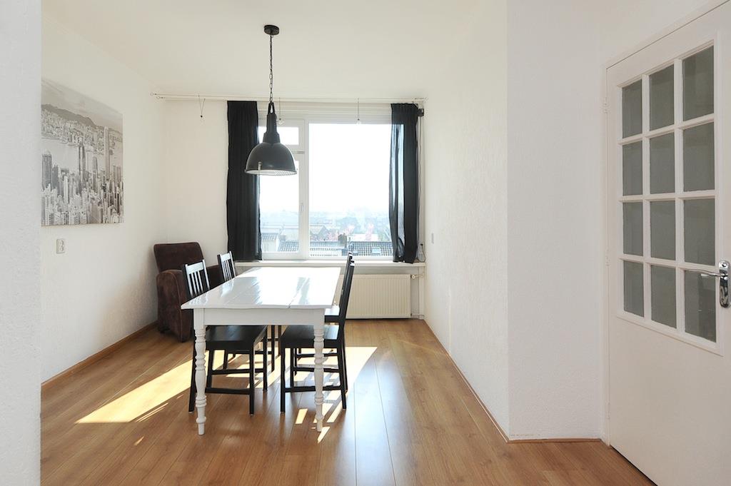 Woon-/ eetkamer met vrij zicht en inbouwkast, keuken voorzien van diverse apparatuur, eetbar en toegang tot balkon op het zuidoosten.
