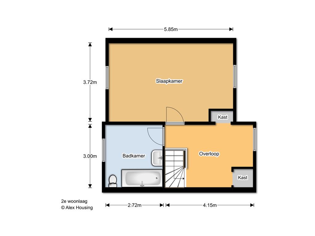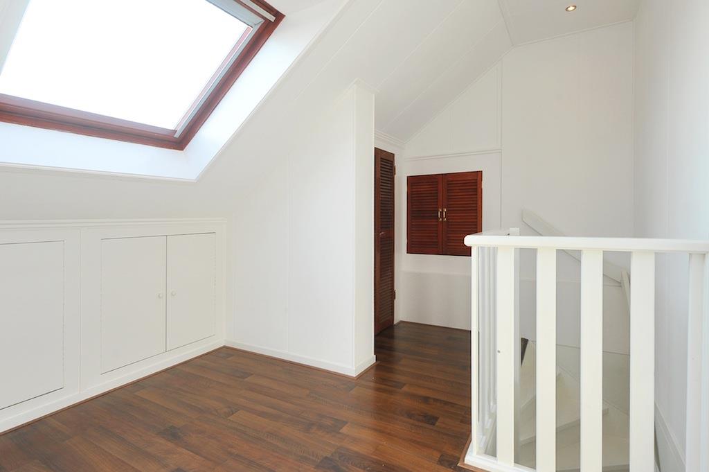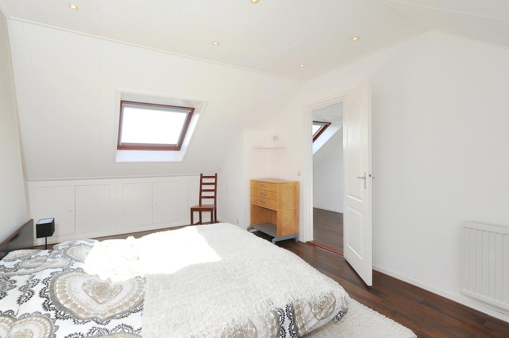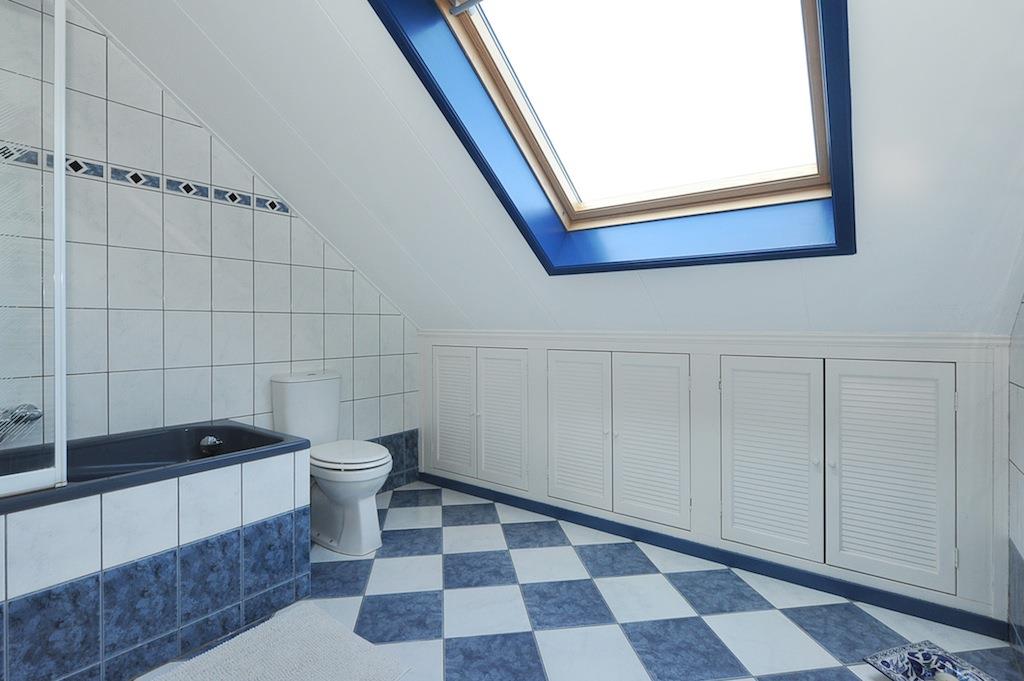 Trap naar de topetage, overloop met veel bergruimte en voldoende ruimte voor een werkhoek, ruime hoofdslaapkamer met Velux ramen en ingebouwde kastruimte, badkamer voorzien van ligbad, toilet en wastafel.