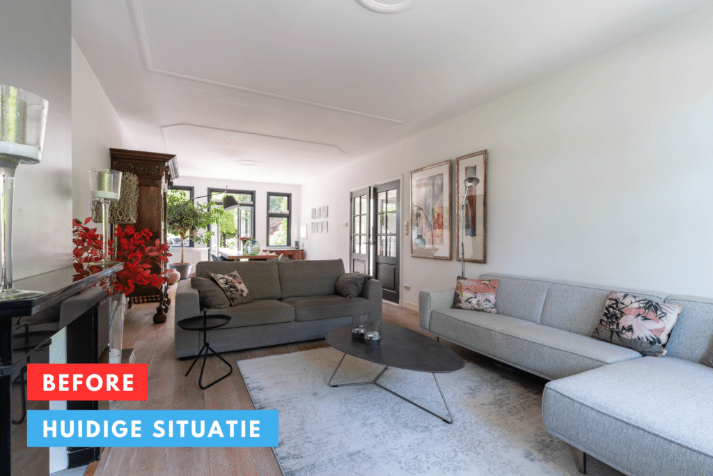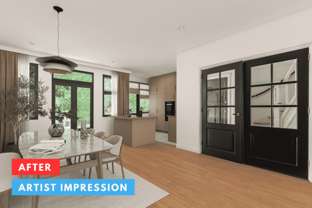 De woonkamer voelt direct bij binnenkomst zeer royaal aan door de enorme lichtinval en openslaande deuren naar de zonnige diepe achtertuin. Mocht er de wens zijn een open keuken te creëren hebben we een impressie toegevoegd.